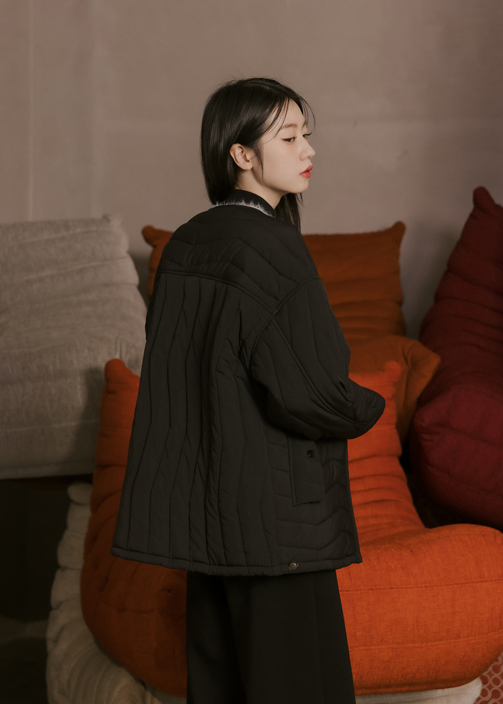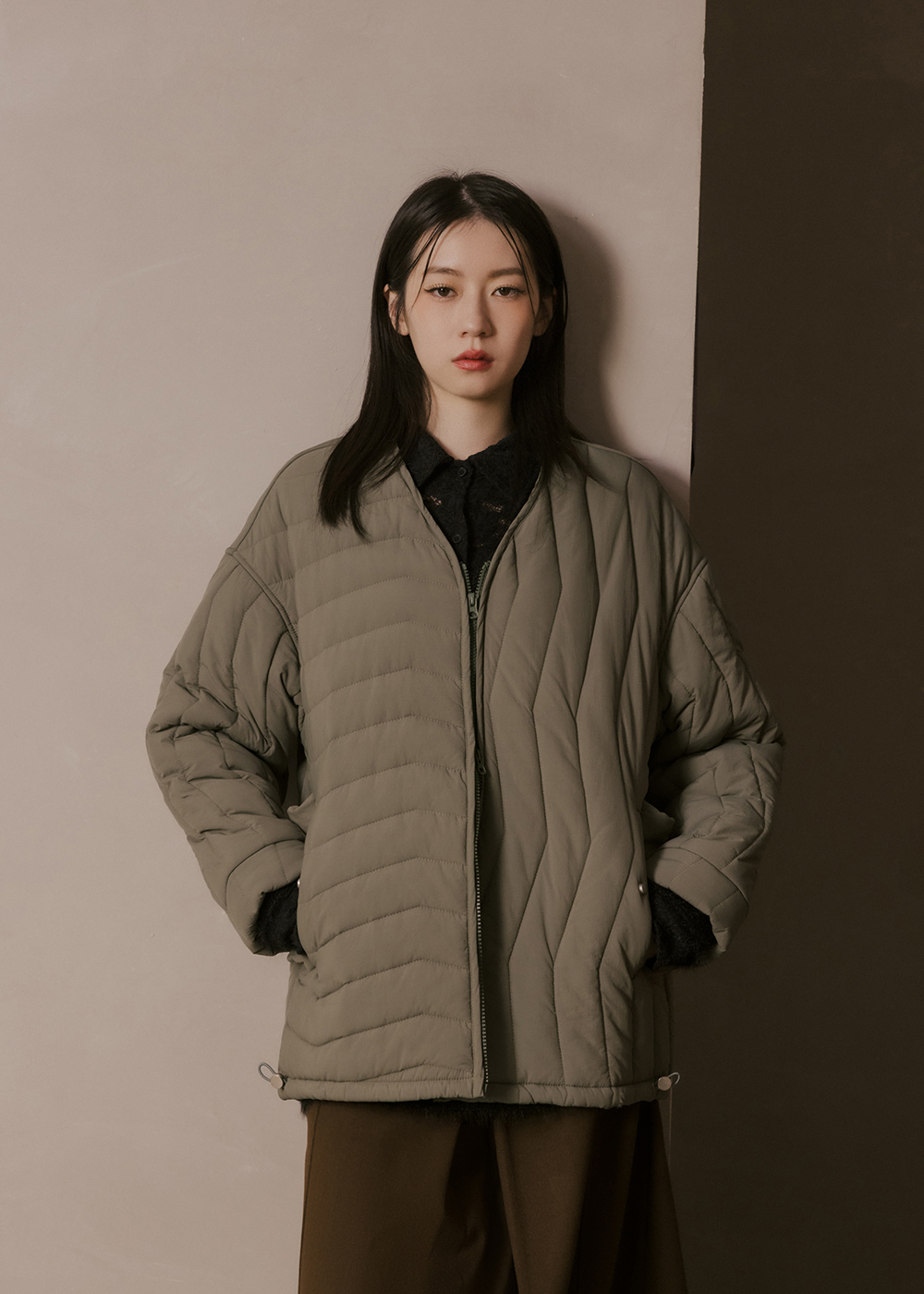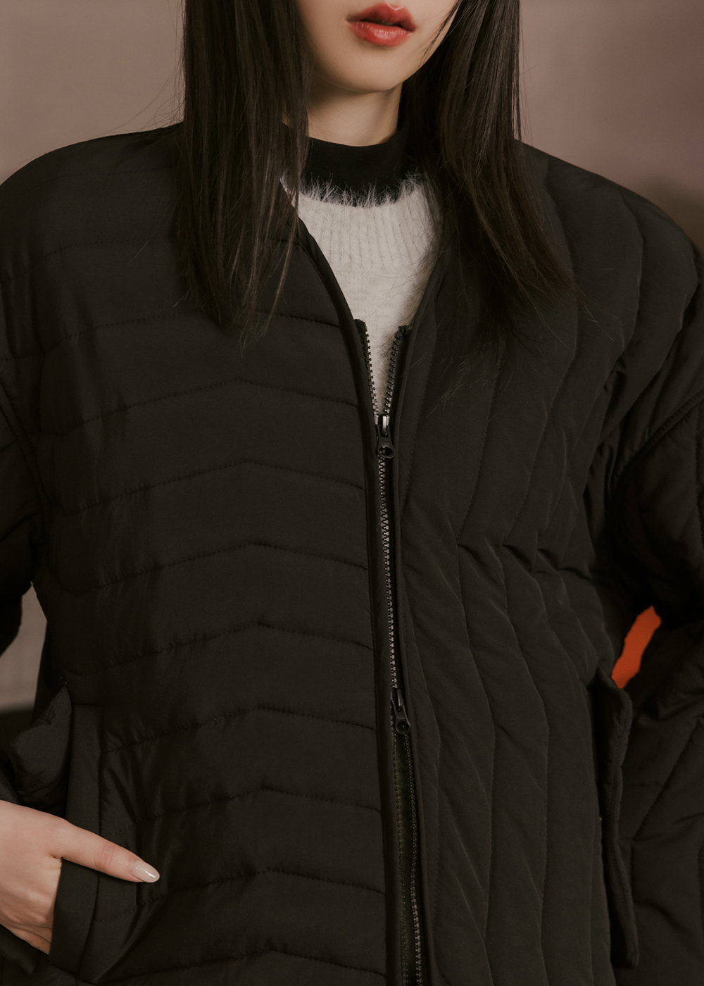 V領鋪棉外套/不對稱壓紋設計