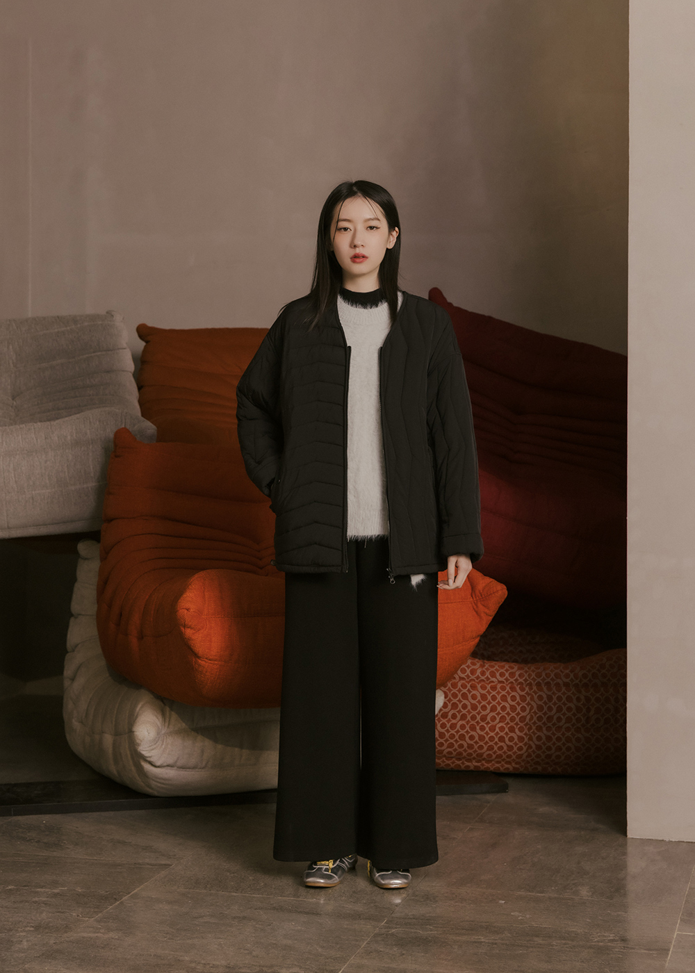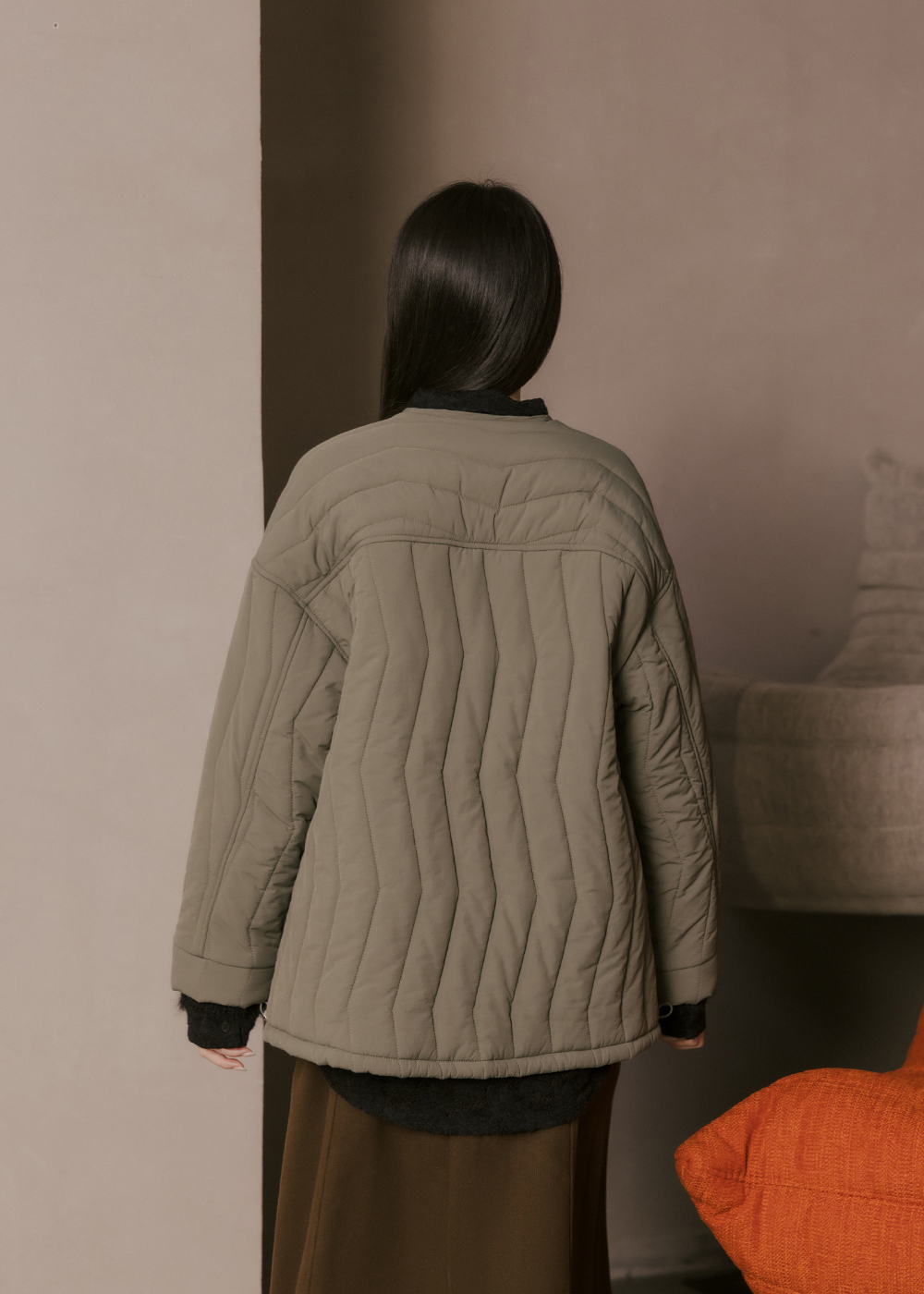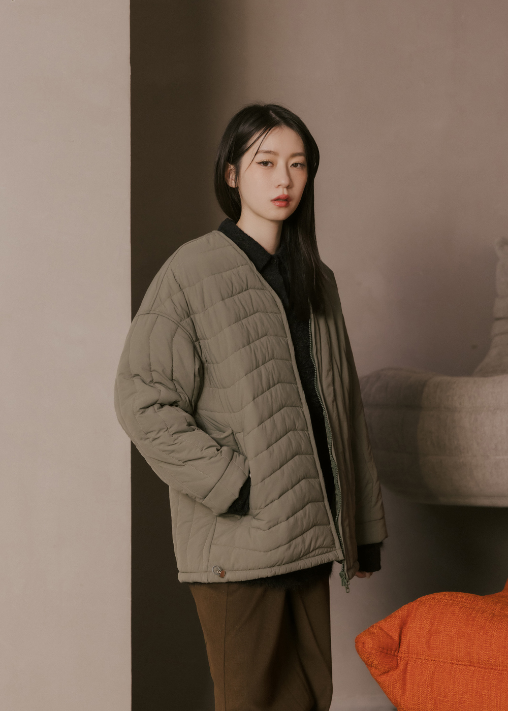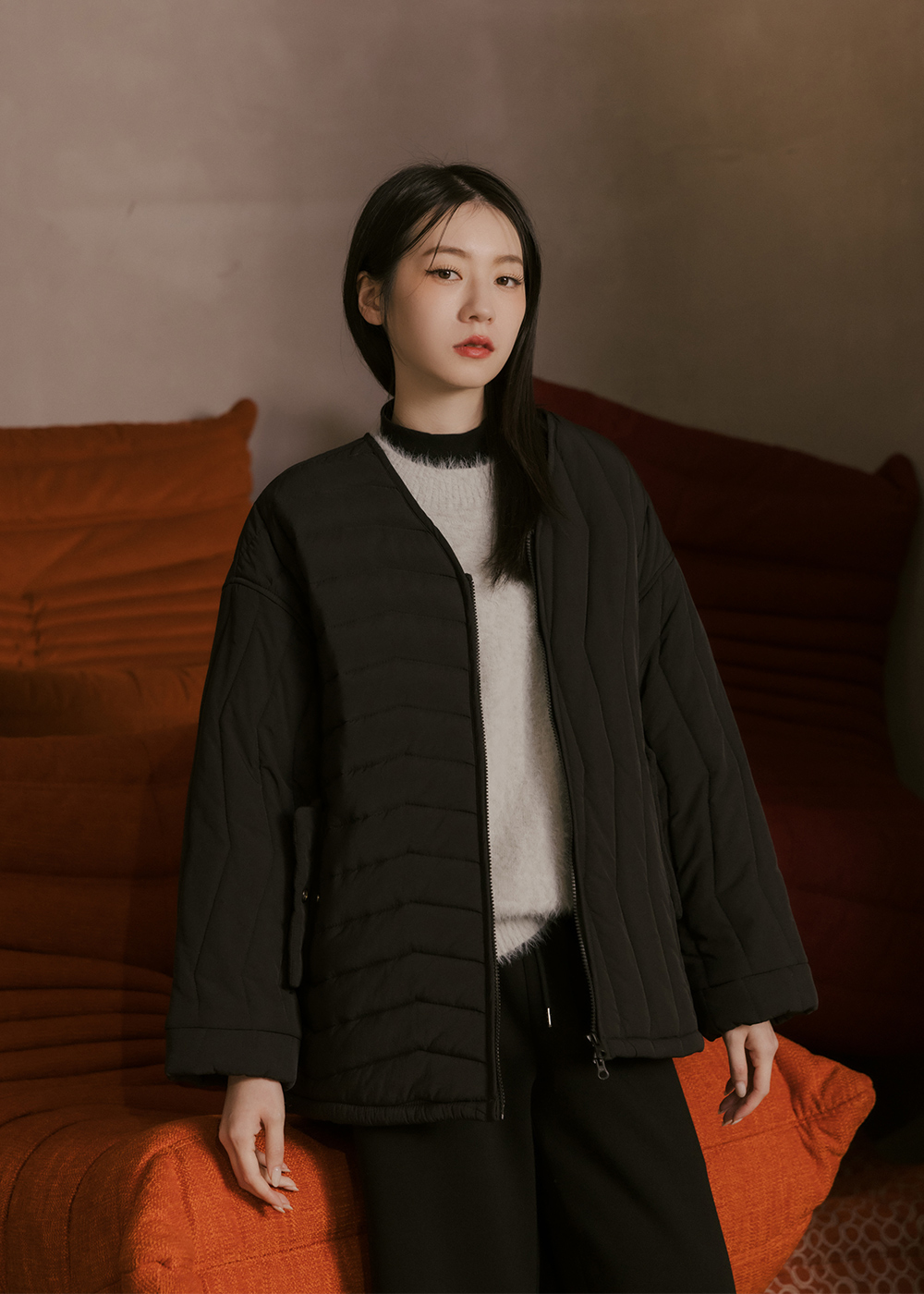 V領鋪棉外套/不對稱壓紋設計