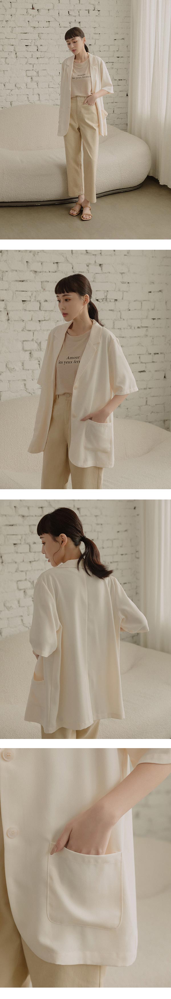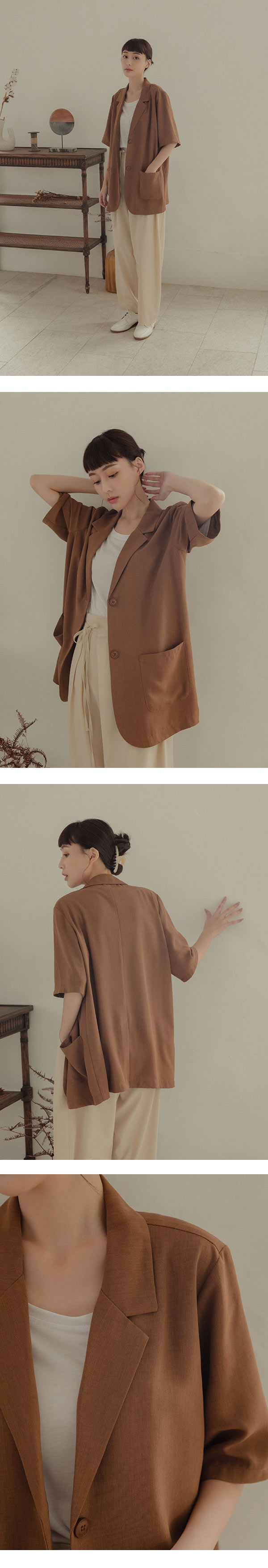 "不易皺的質感面料/前片有對稱插袋/後有開衩