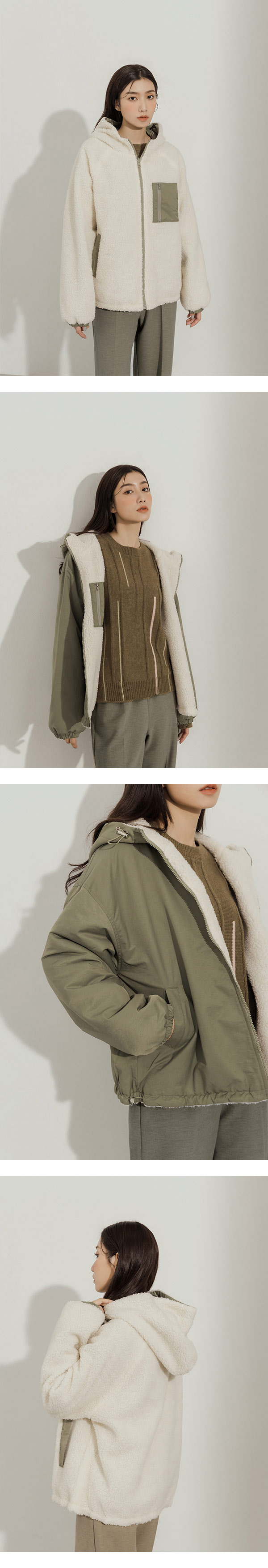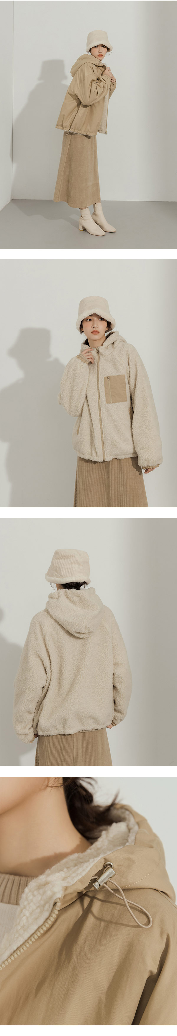 保暖可愛的羊羔毛撞色拉鍊式貼袋