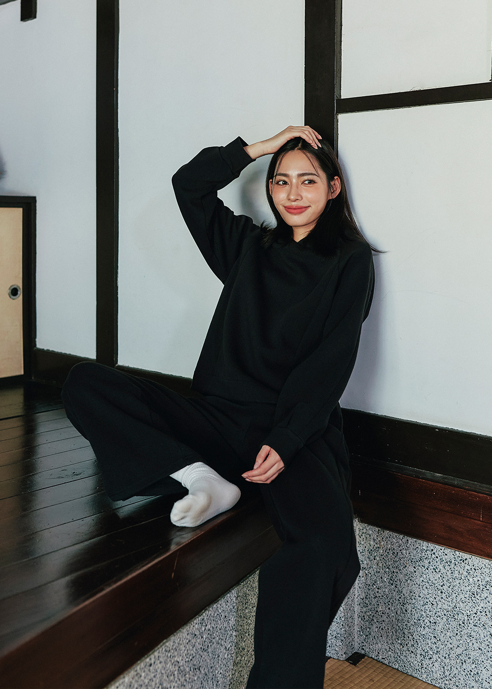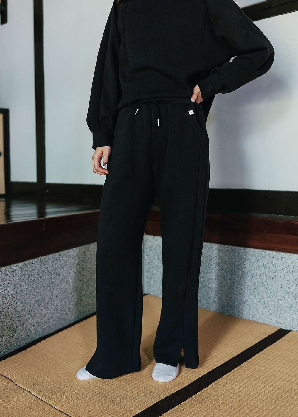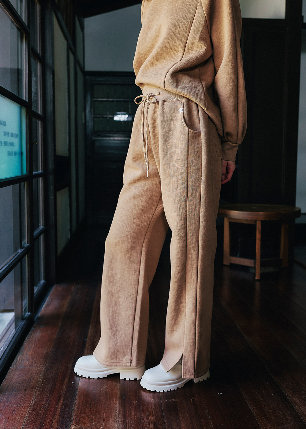 連帽休閒褲型顯瘦的前切剪接線