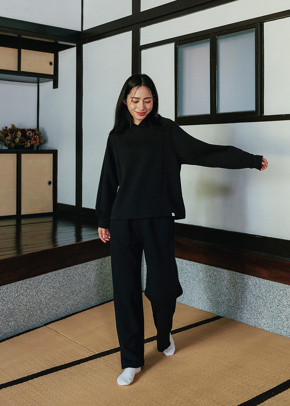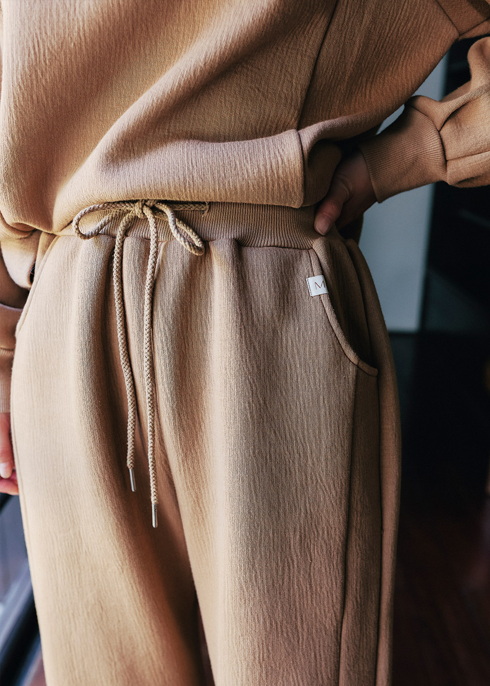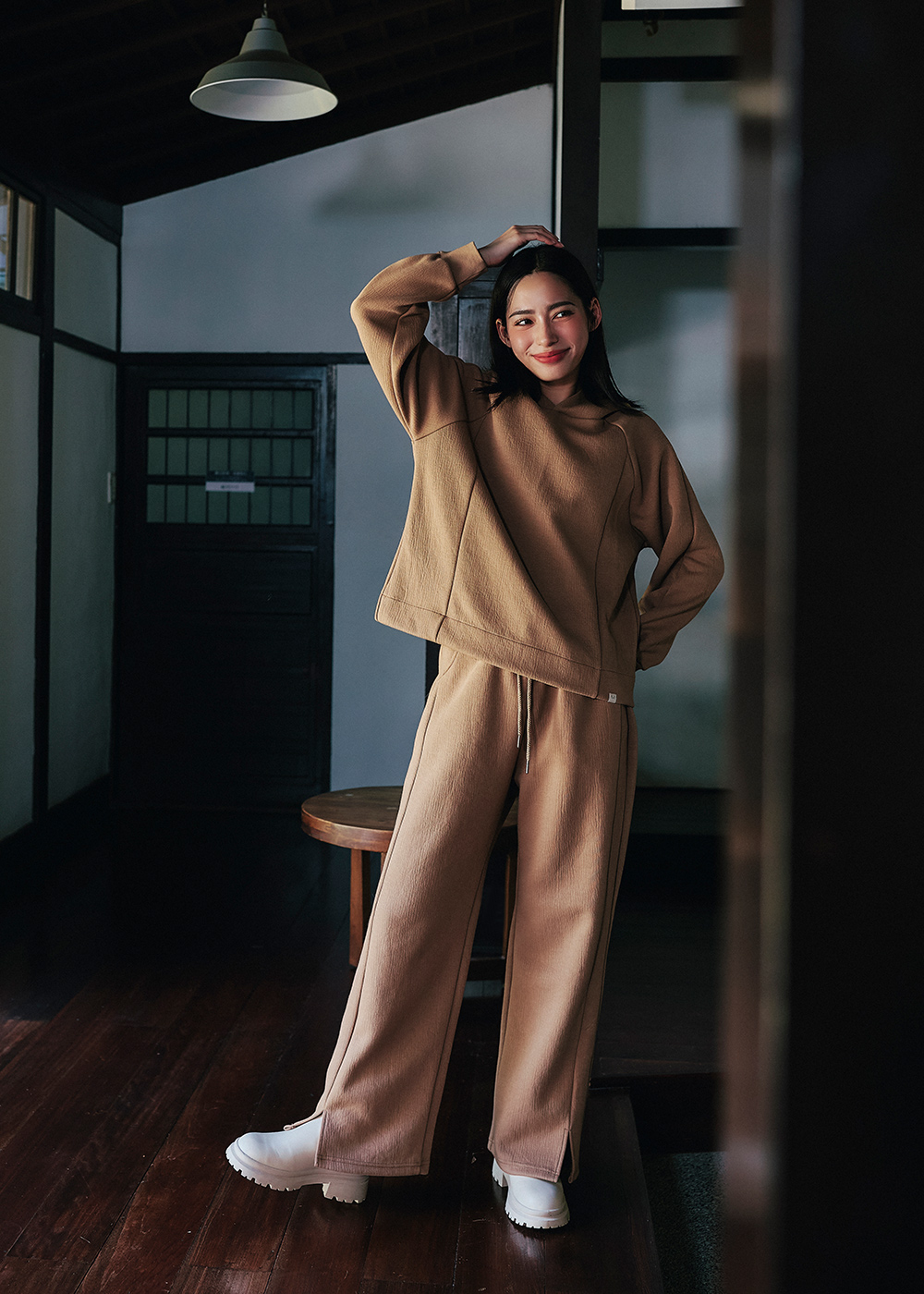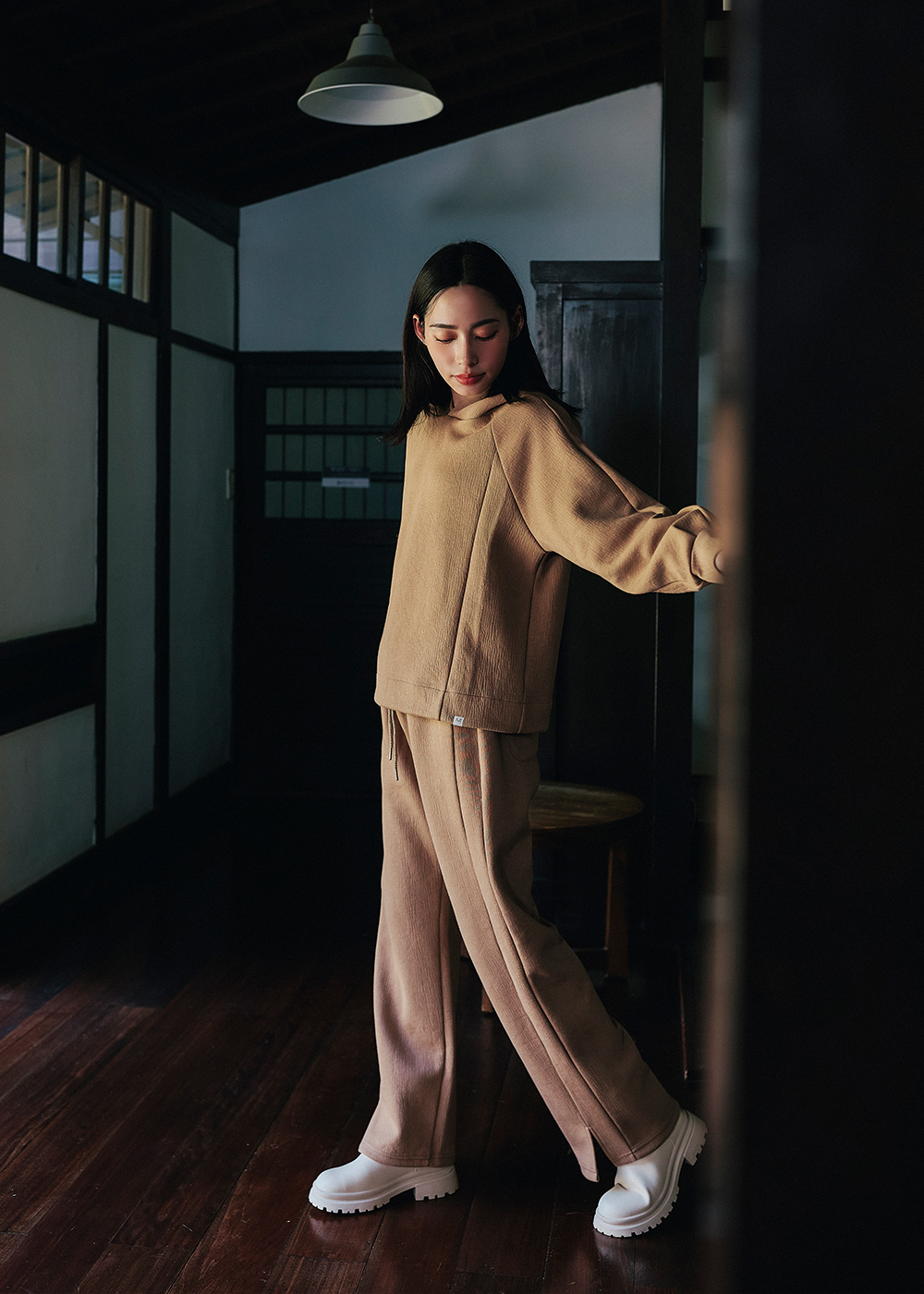 連帽休閒褲型顯瘦的前切剪接線