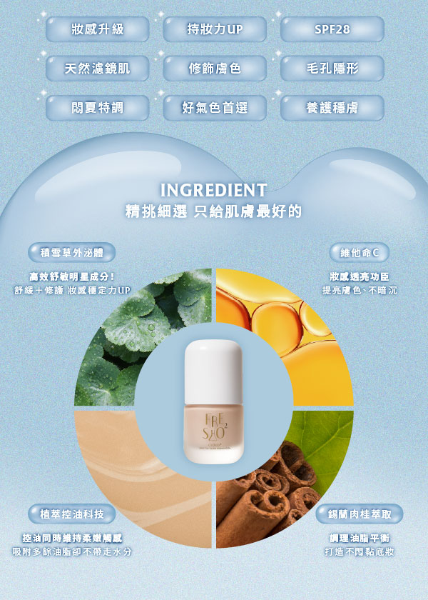 使用錫蘭肉桂萃取結合獨家植萃控油粉體科技,實現輕盈絲滑延展性,智能貼合膚質