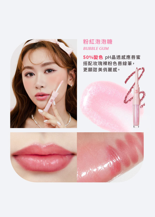 極細筆芯精準勾勒出飽滿立體的唇形,掌控完美輪廓;pH值晶透感應唇蜜