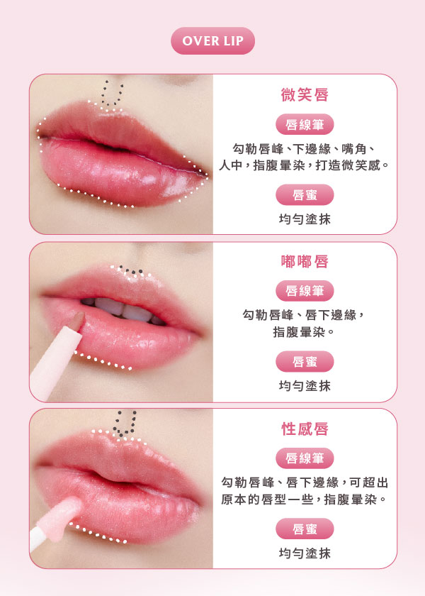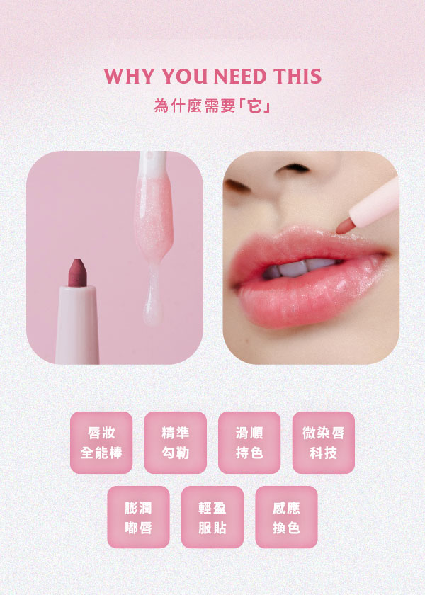 極細筆芯精準勾勒出飽滿立體的唇形,掌控完美輪廓;pH值晶透感應唇蜜