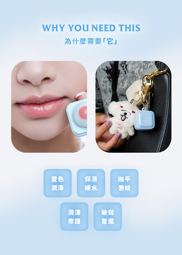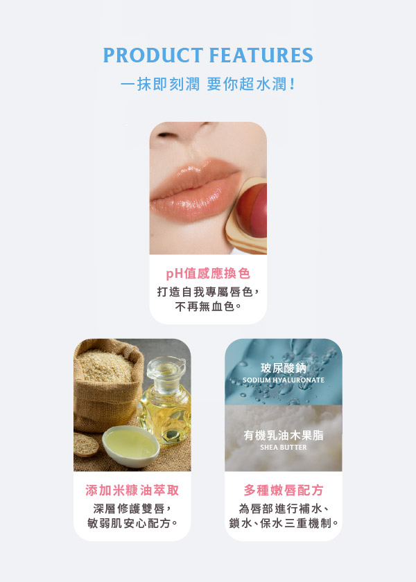 同時為唇部進行補水、鎖水、保水三重機制,打造專屬唇色,閃耀水潤光澤。