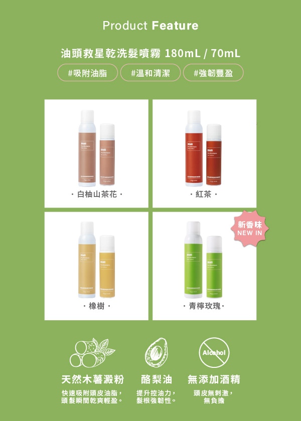"超強吸油力的極細緻木薯澱粉,快速吸附頭皮油脂,保持頭髮乾爽輕盈,同時添加酪梨油成分