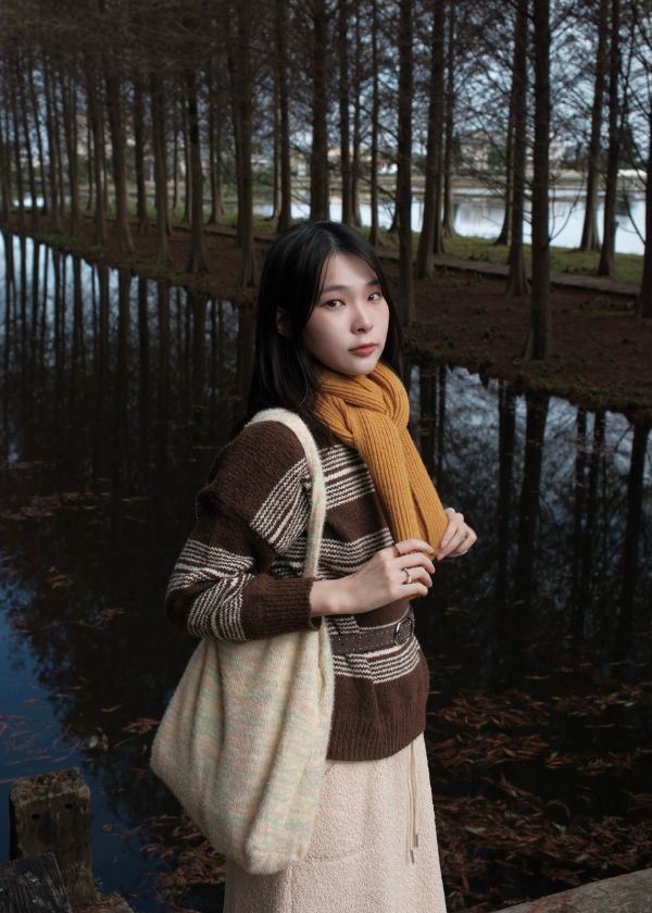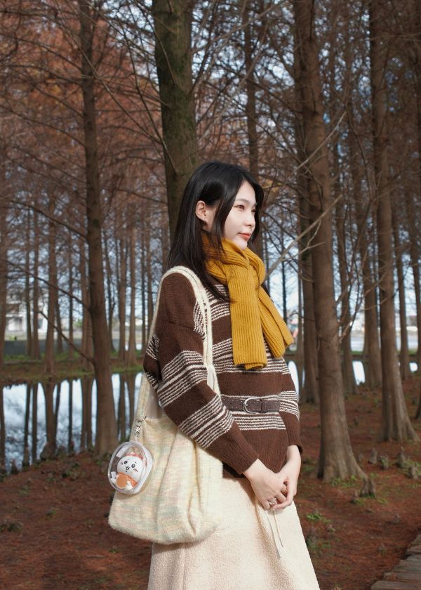 穿搭重點:慵懶捲捲毛舒芙蕾長裙、特色密條質感毛衣