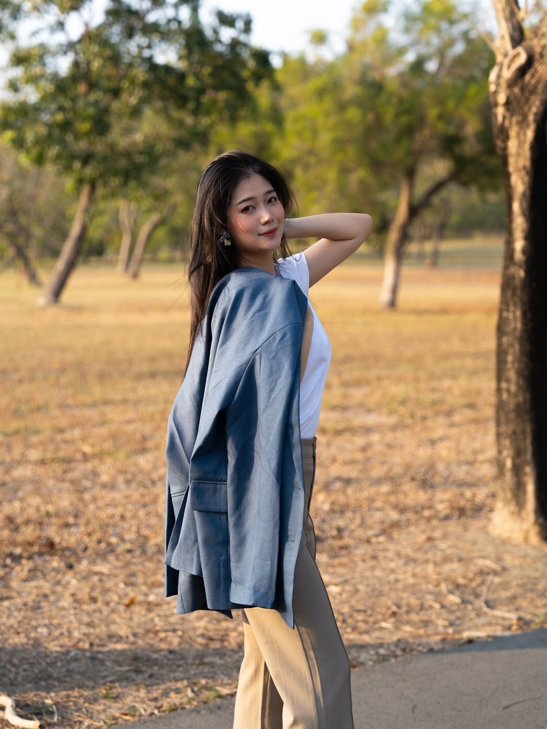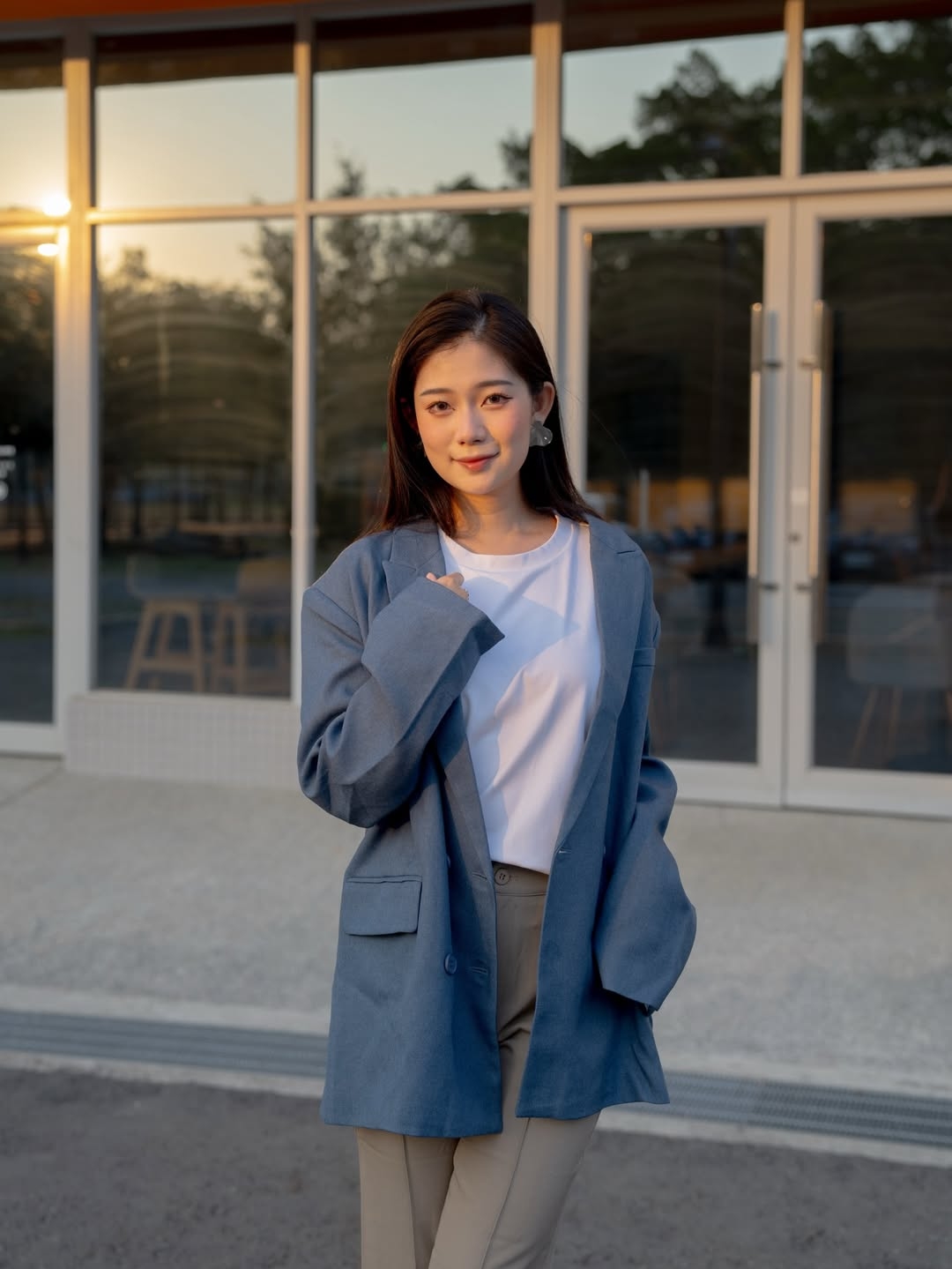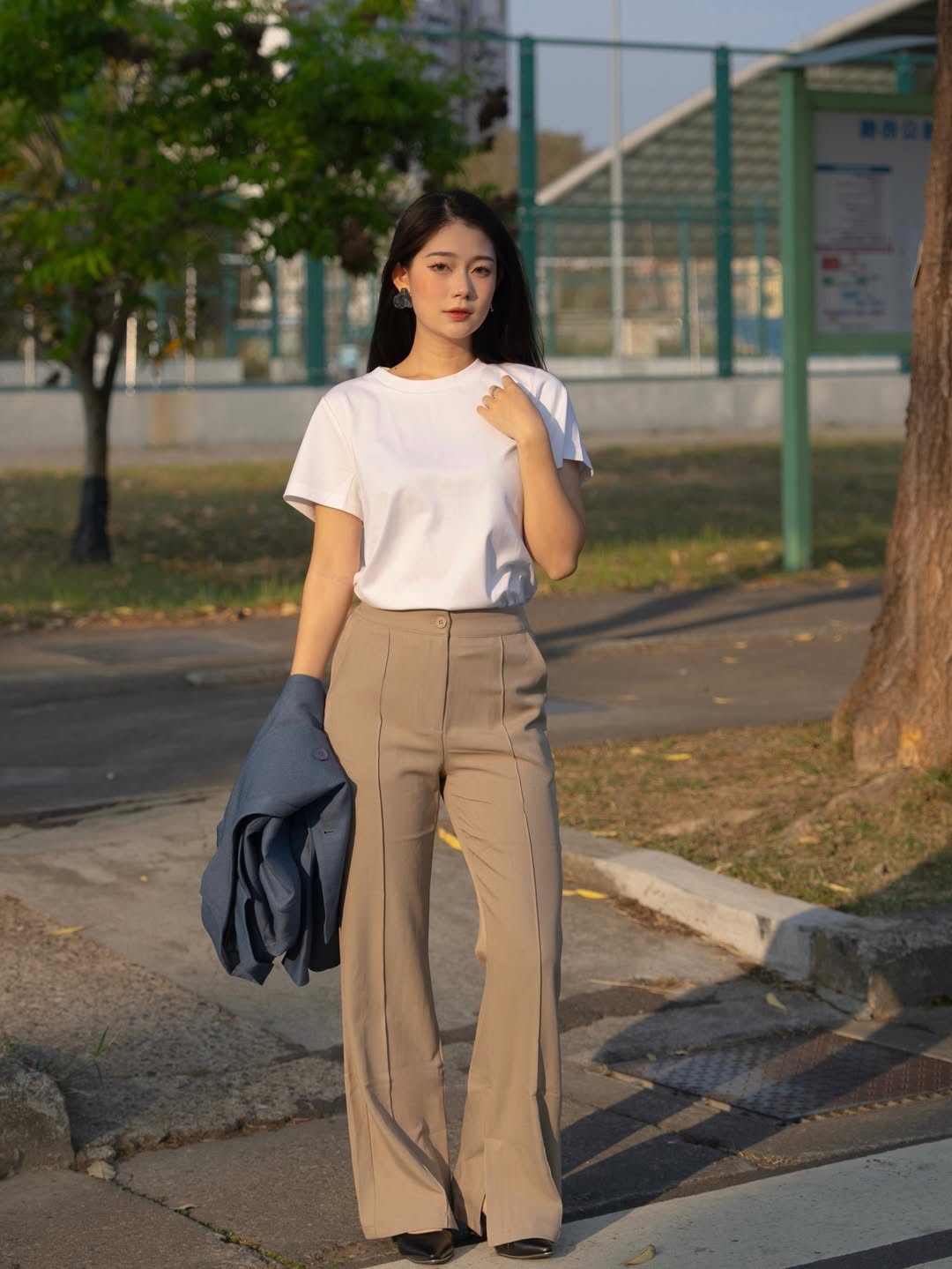 穿搭重點:液態氨柔挺棉-剛剛好基本T恤、老錢風斜紋西裝外套、長腿顯瘦修長褲