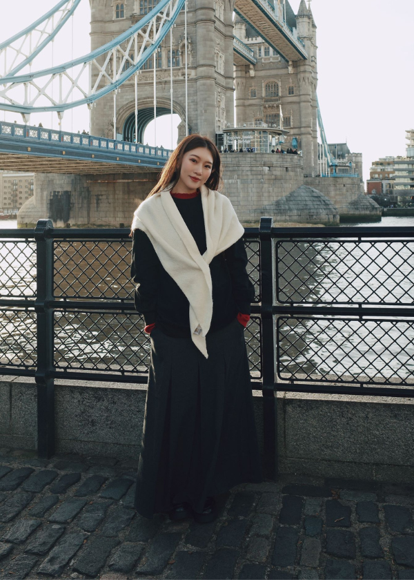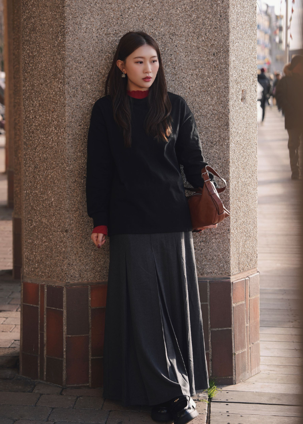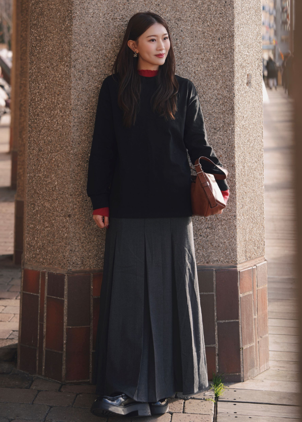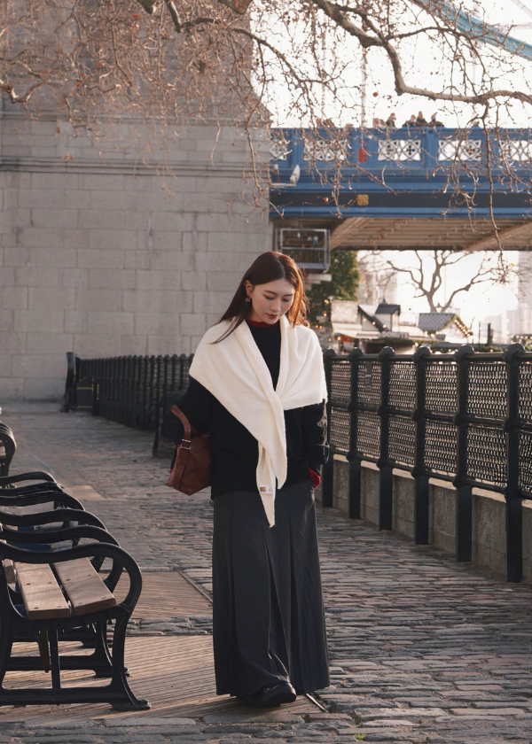 穿搭重點:經典挺版純棉上衣、設計感修身百褶毛呢長裙、羊毛質感百搭大披肩