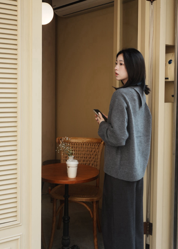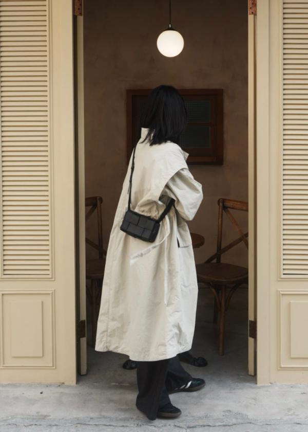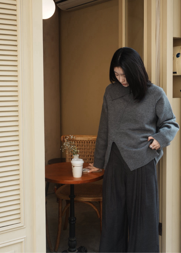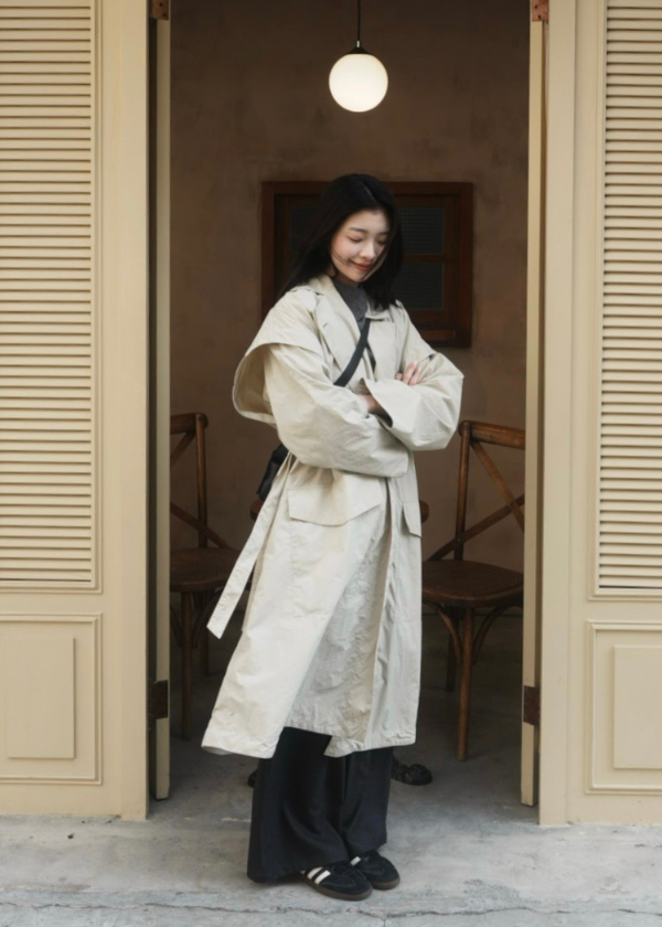 穿搭重點:走路都有風質感寬鬆風衣、不對稱領開衩針織上衣、不對稱腰頭剪接打褶廓腿西裝褲