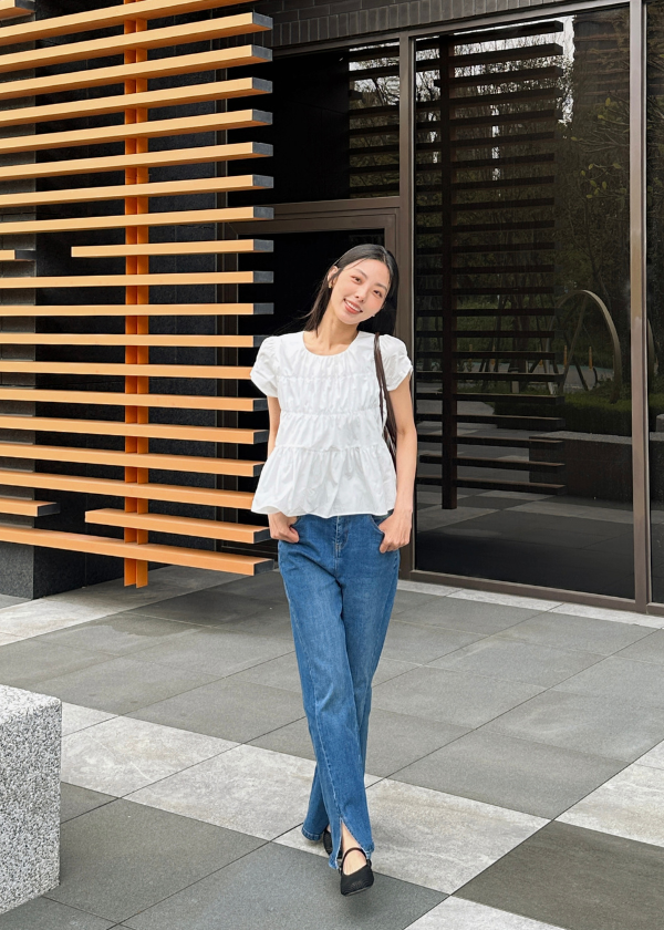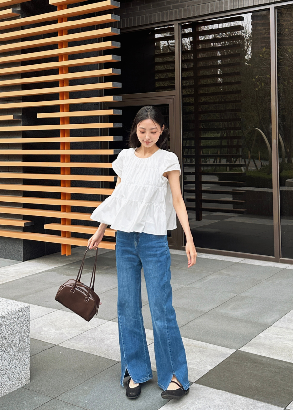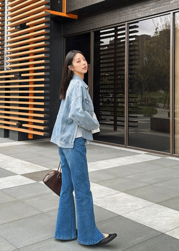穿搭重點:仿舊水洗感側開叉丹寧外套、細緻荷葉A襬上衣、 時髦筷子腿彈力開叉丹寧褲