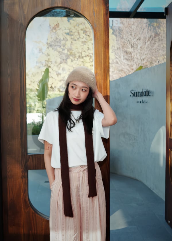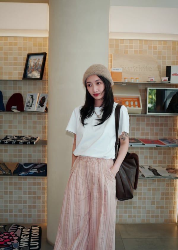 穿搭重點:液態氨柔挺棉-剛剛好基本T恤、微皺感直條紋寬褲