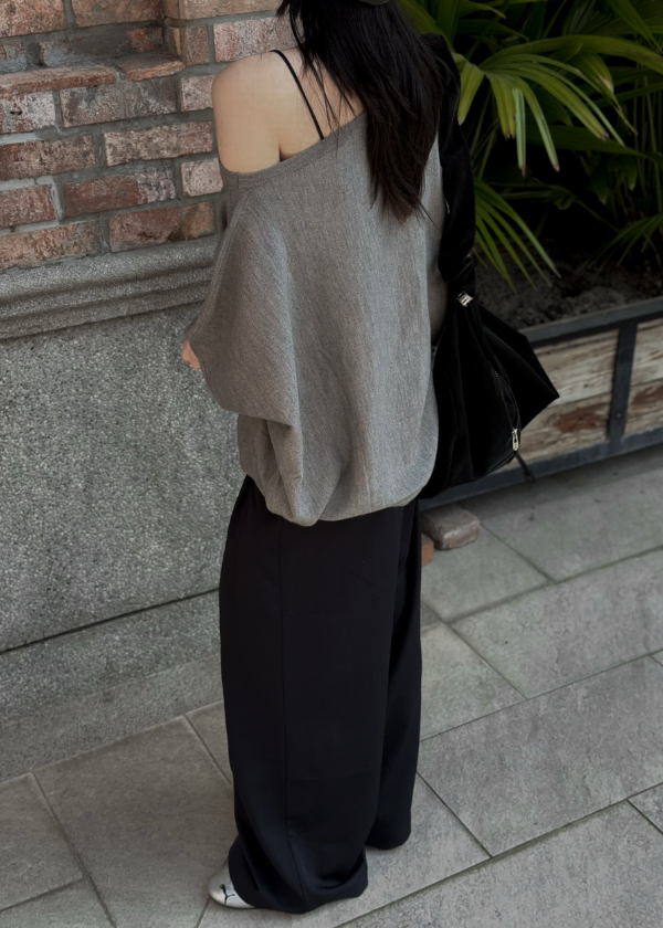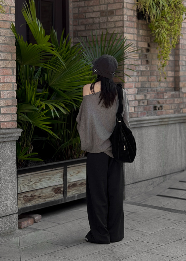 穿搭重點:美麗諾羊毛斜肩上衣、高腰綁帶率性直筒寬褲