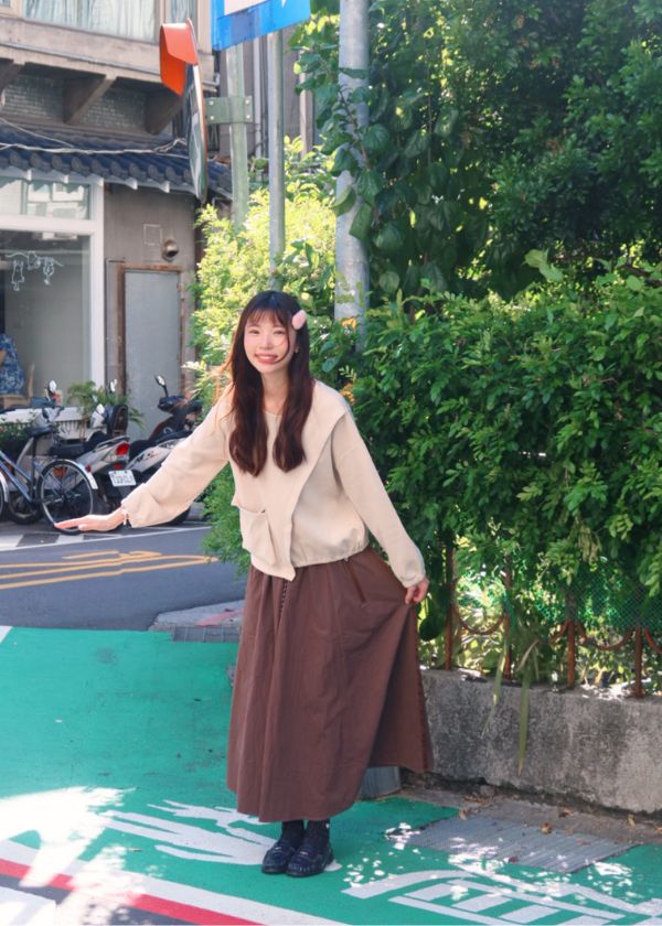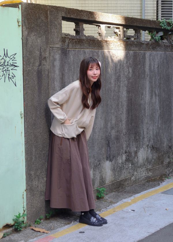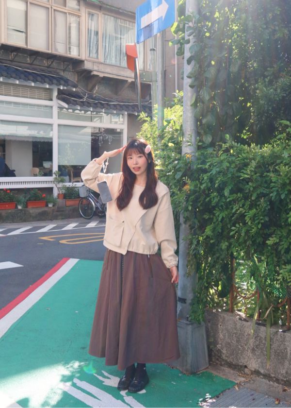 穿搭重點:舒適特色口袋上衣 輕鬆日常A字長裙