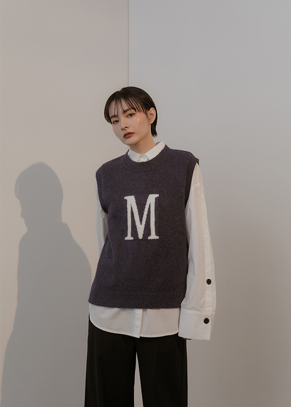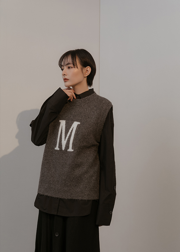 穿搭重點:素色簡約大釦襯衫、M字母緹花針織背心、率性打折開岔西裝褲