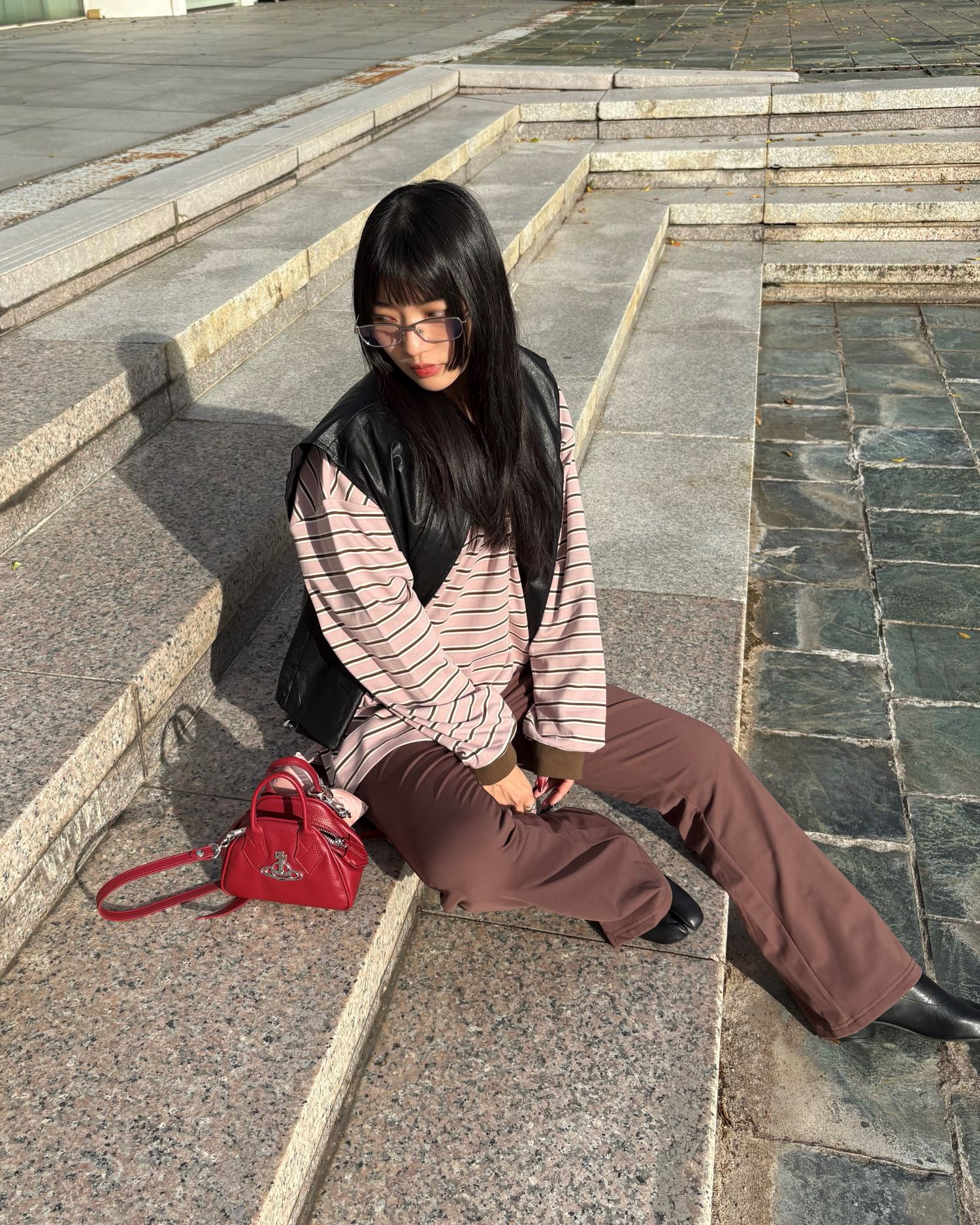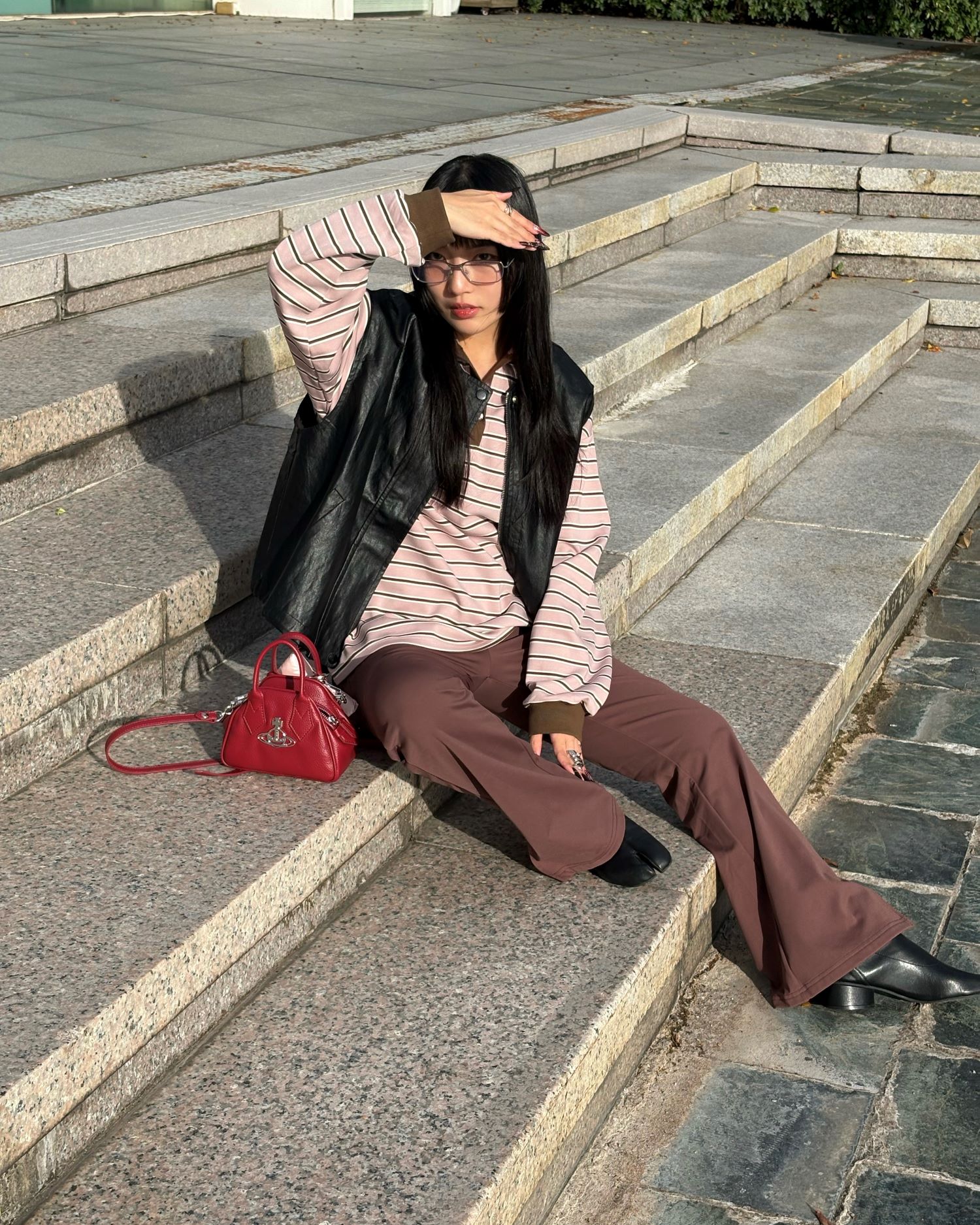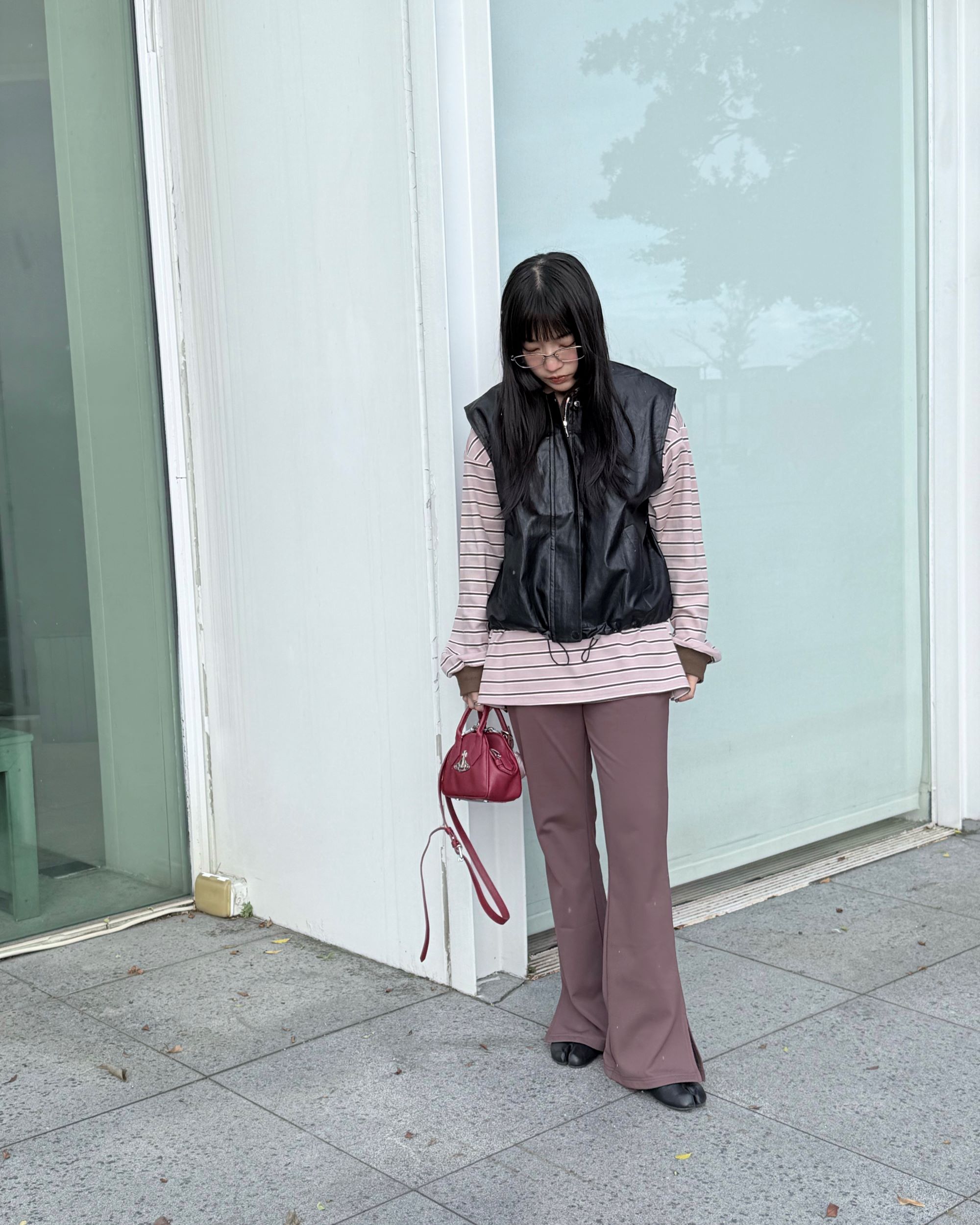 穿搭重點:輕塑乳霜-自在纖瘦微喇叭褲,條紋polo柔軟上衣,質感縮口有型皮背心