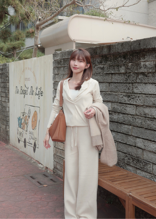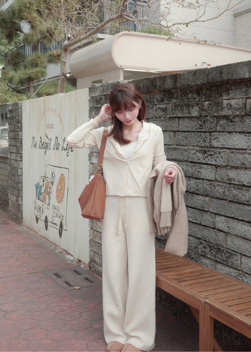 穿搭重點:寬鬆慵懶-雪Q針織外套、慵懶修身-雪Q針織長褲、輕塑乳霜-連帽V領纖瘦剪裁上衣