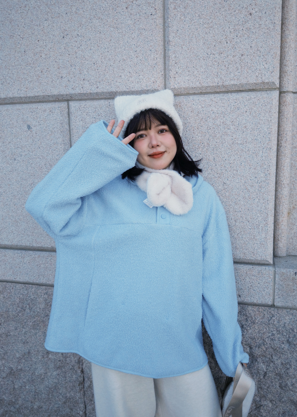 穿搭重點:捲捲毛舒服蕾-連帽口袋大學T、慵懶修身-雪Q針織長褲