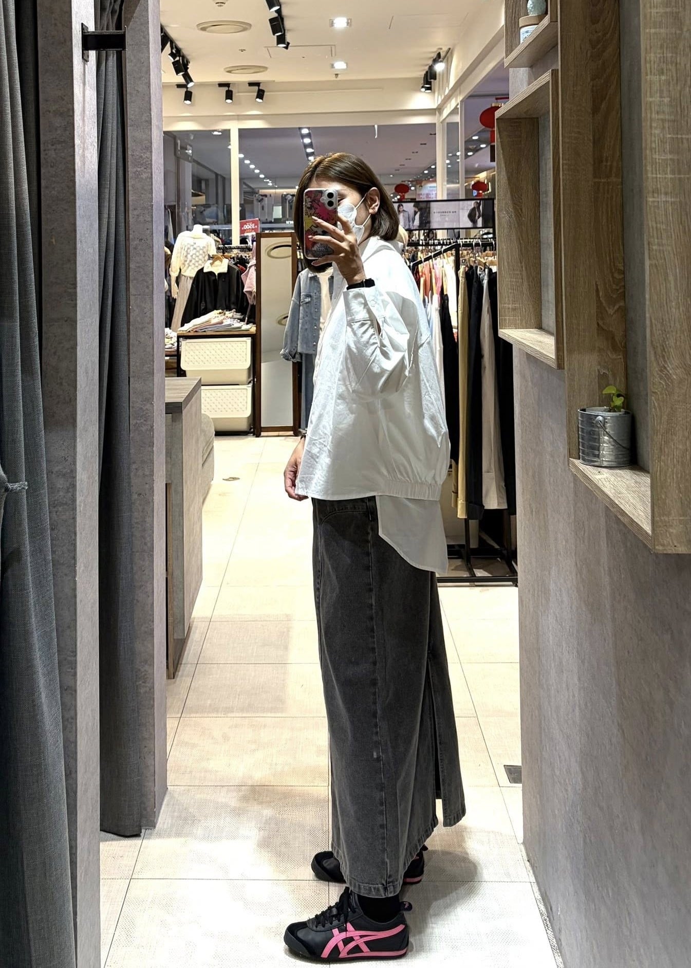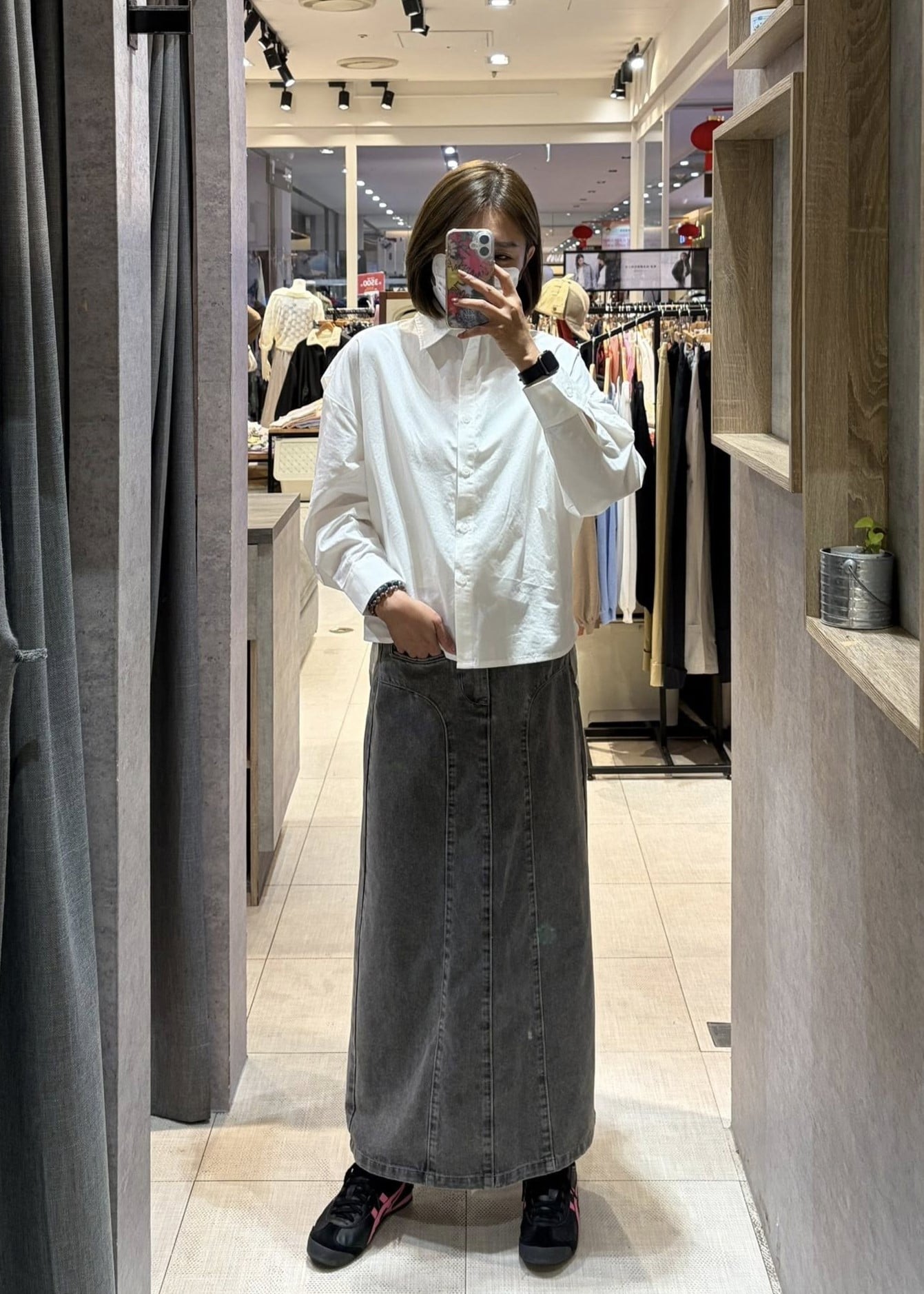 穿搭重點:設計感假兩件襯衫外套、視覺顯瘦剪接線牛仔裙