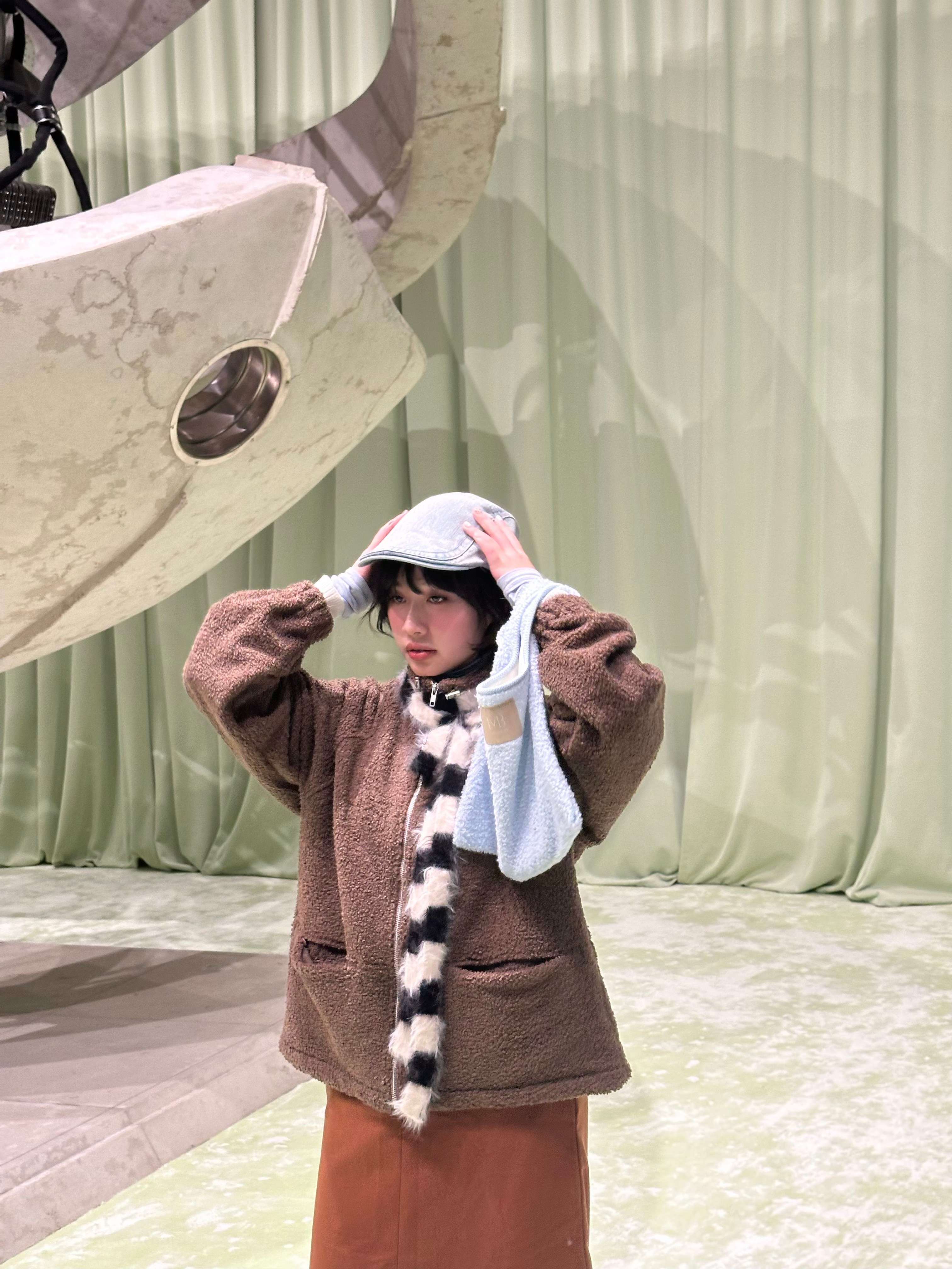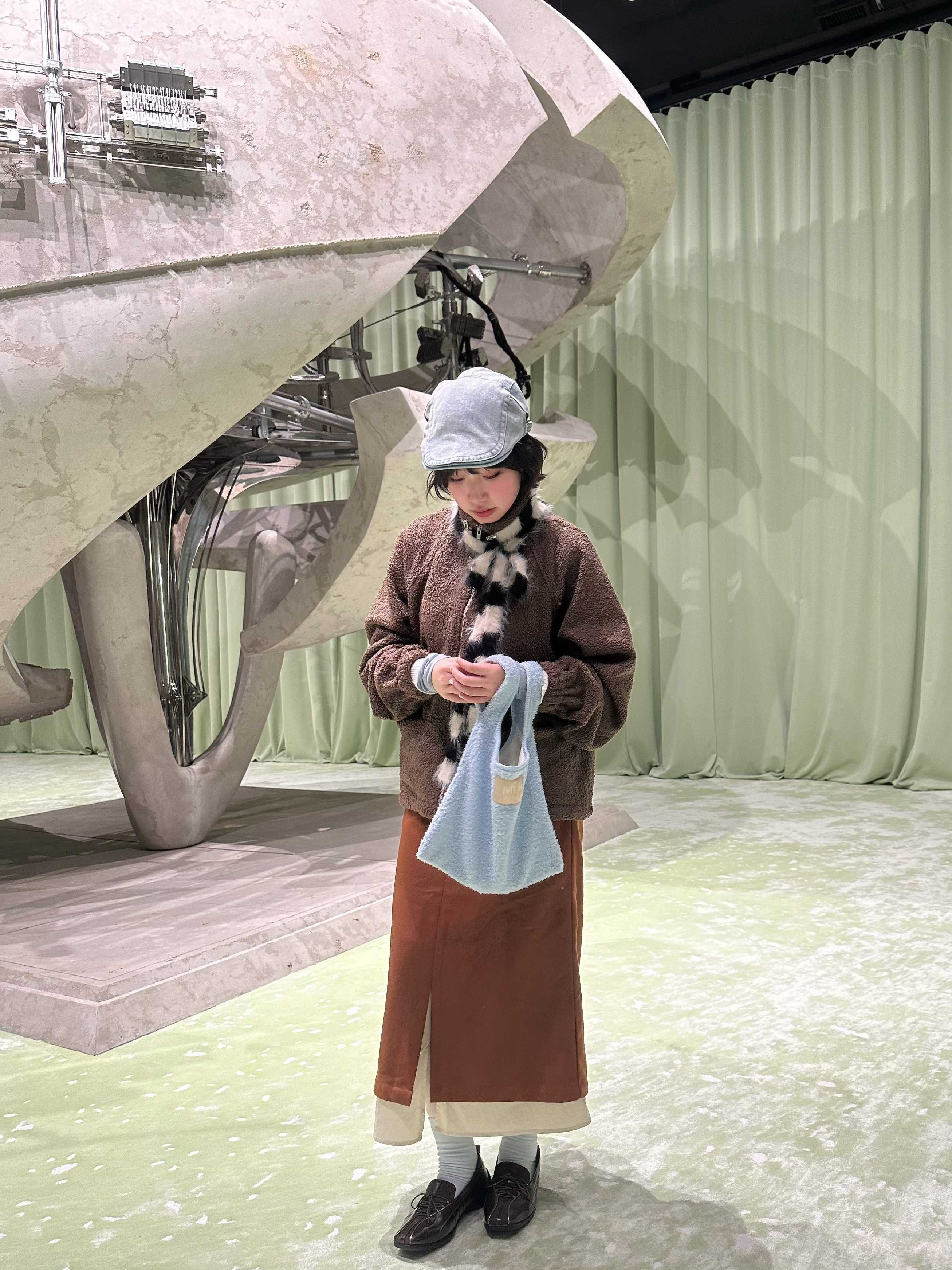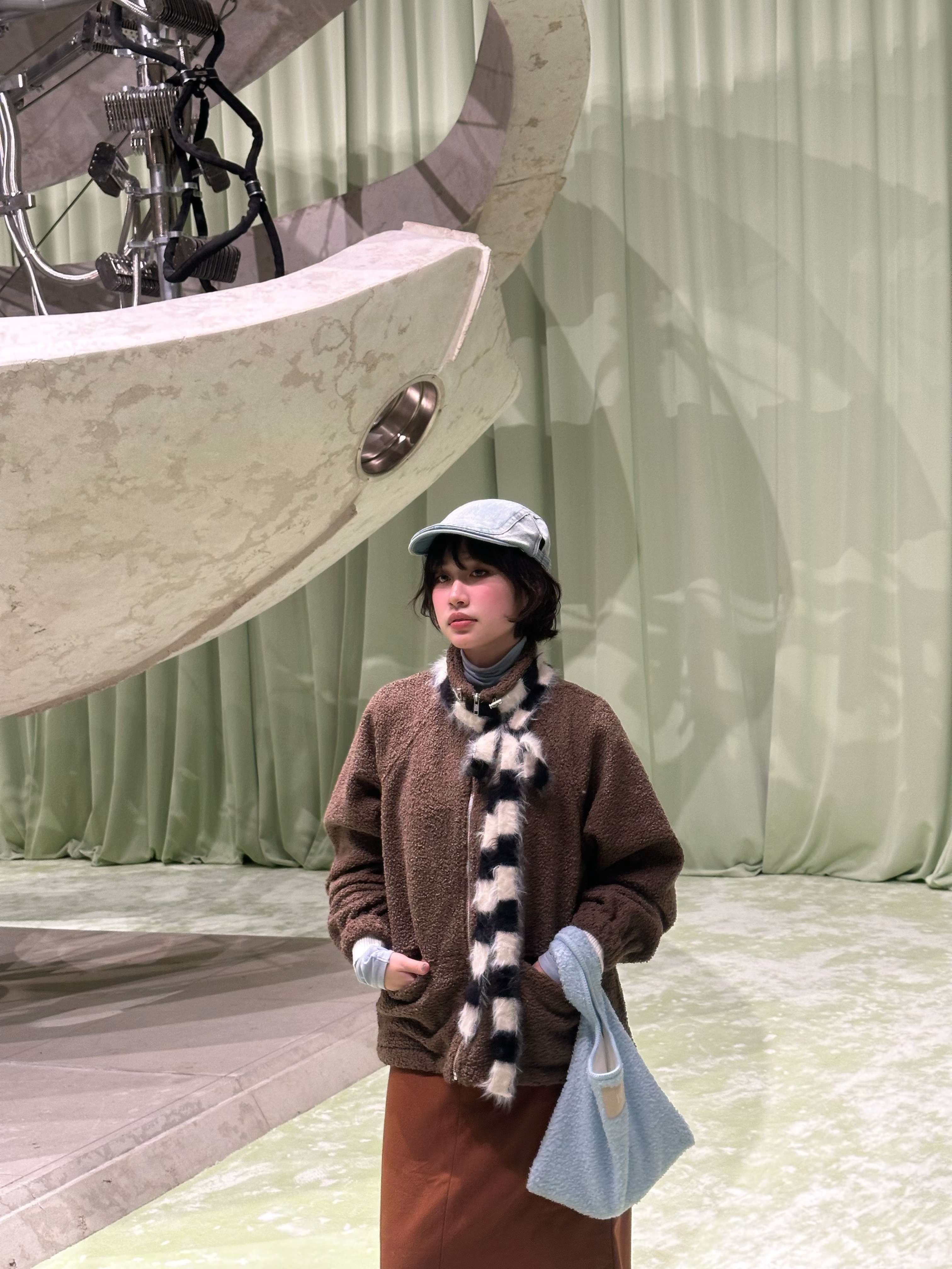 穿搭重點:捲捲毛舒服蕾-小立領拉鍊外套、捲捲毛舒服蕾-溫暖心意購物袋、質感雙層撞色長裙