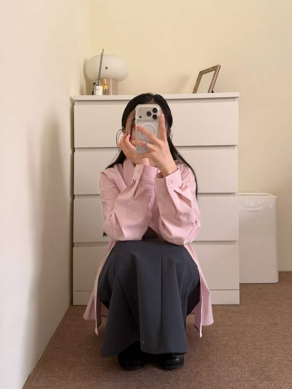 穿搭重點:輕暖舒彈-防潑水修身剪裁長裙,Clean&Tidy俐落有型防汙襯衫