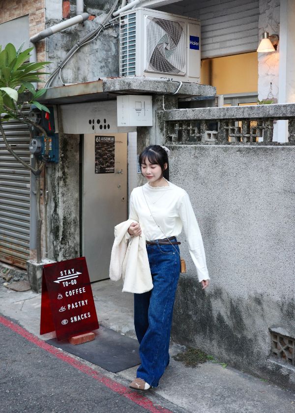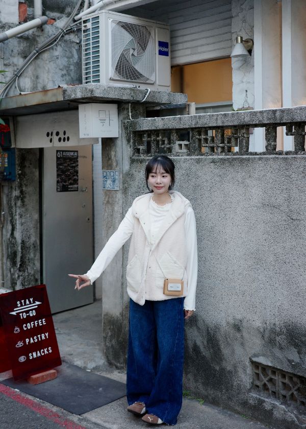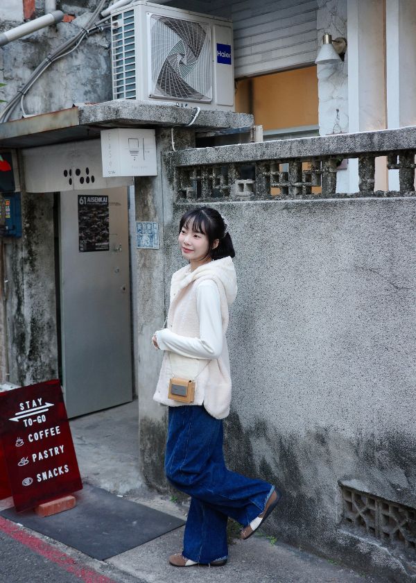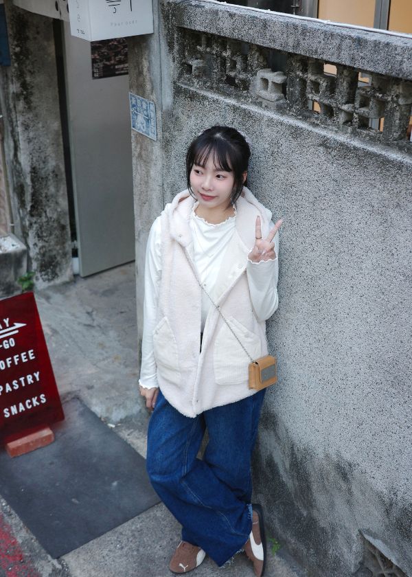 穿搭重點:雙面穿燈芯絨毛背心、親膚絨面木耳邊搭配上衣、顯瘦長腿直筒丹寧褲