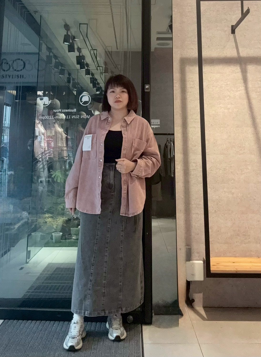 穿搭重點:丹寧個性水洗口袋襯衫、交叉美背仙女bra top、視覺顯瘦剪接線牛仔裙、性錐形打褶長褲