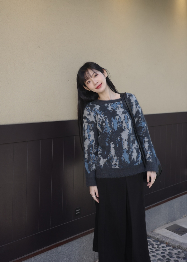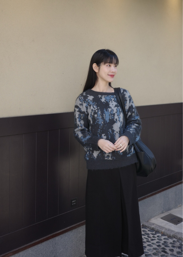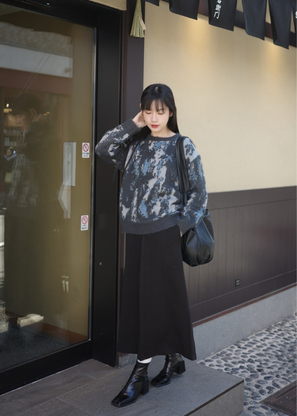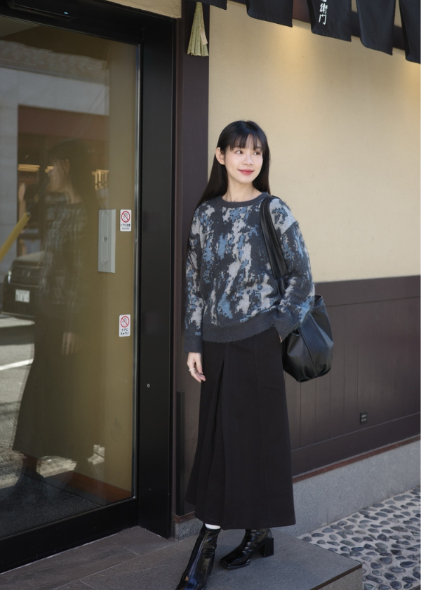 穿搭重點:設計毛感紋路針織上衣、挺版紋理A字長裙