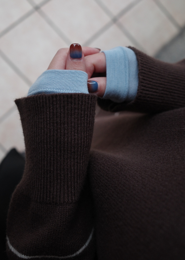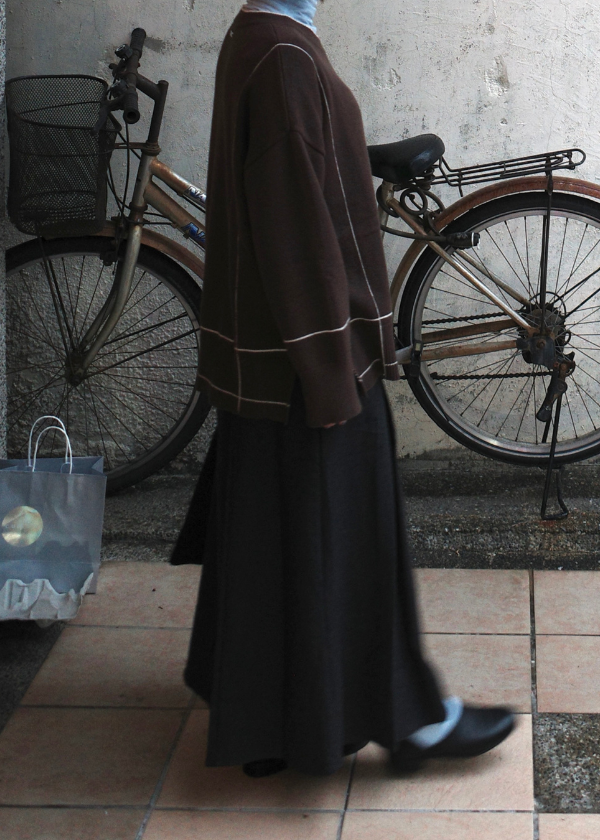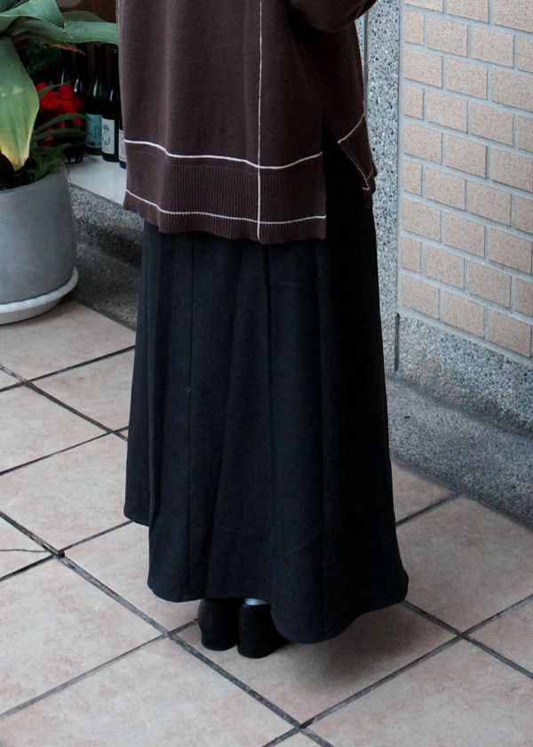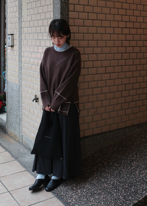 穿搭重點:設計感修身百褶毛呢長裙、設計線條開衩針織上衣