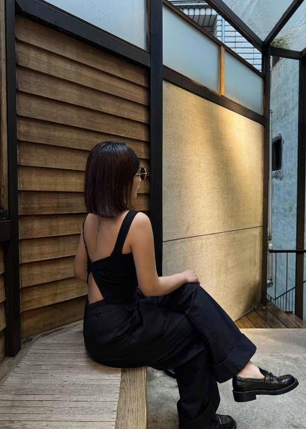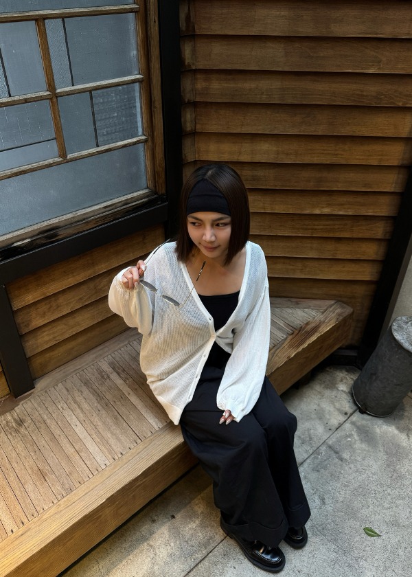 穿搭重點:方領寬後紐結bra top背心、必備百搭針織外套、日常好搭經典長褲