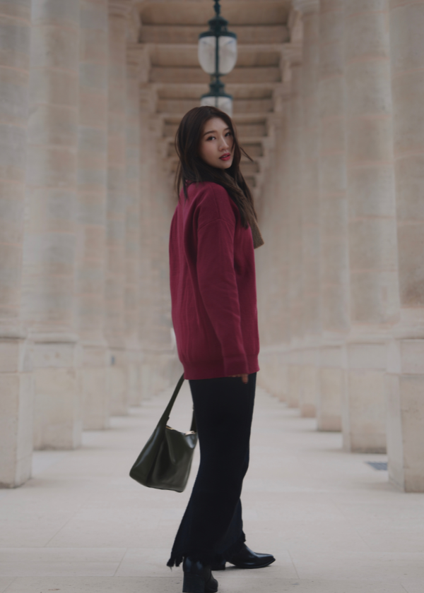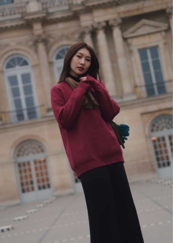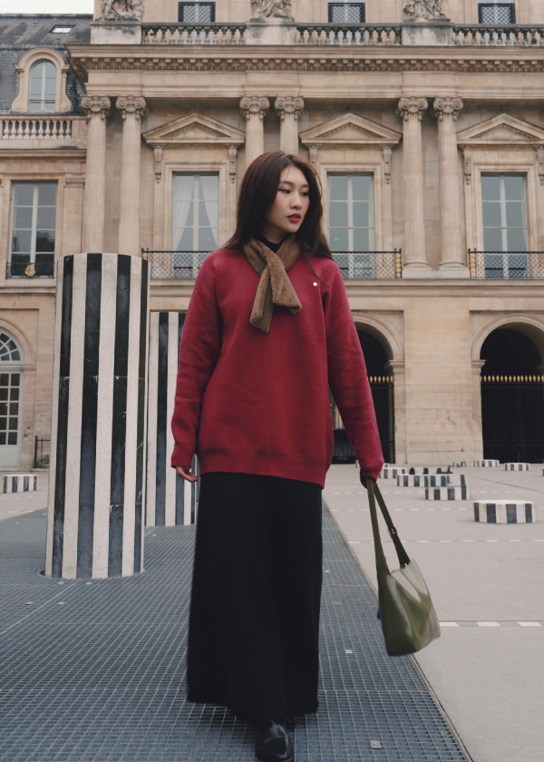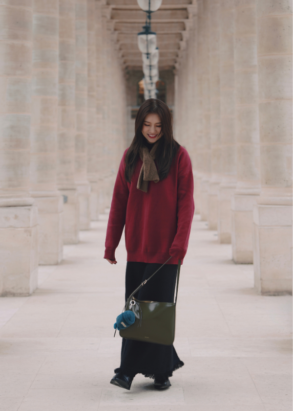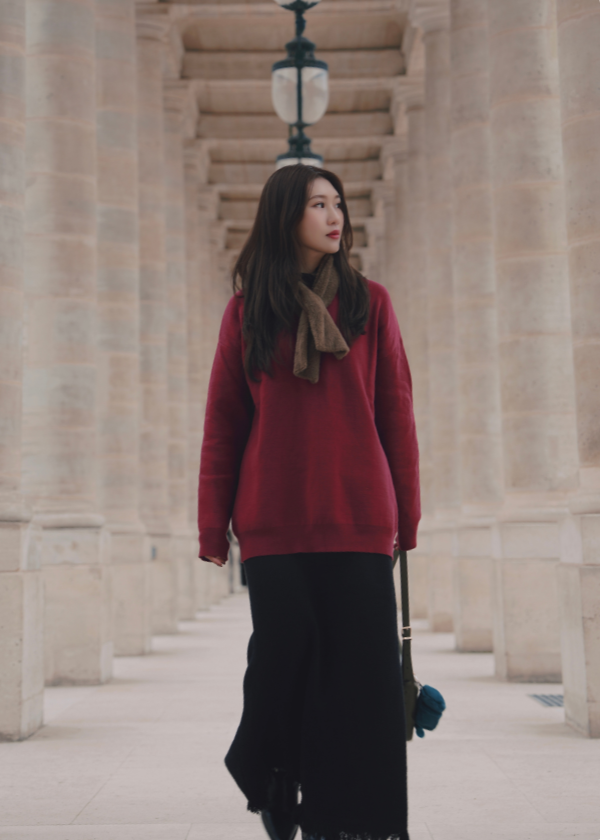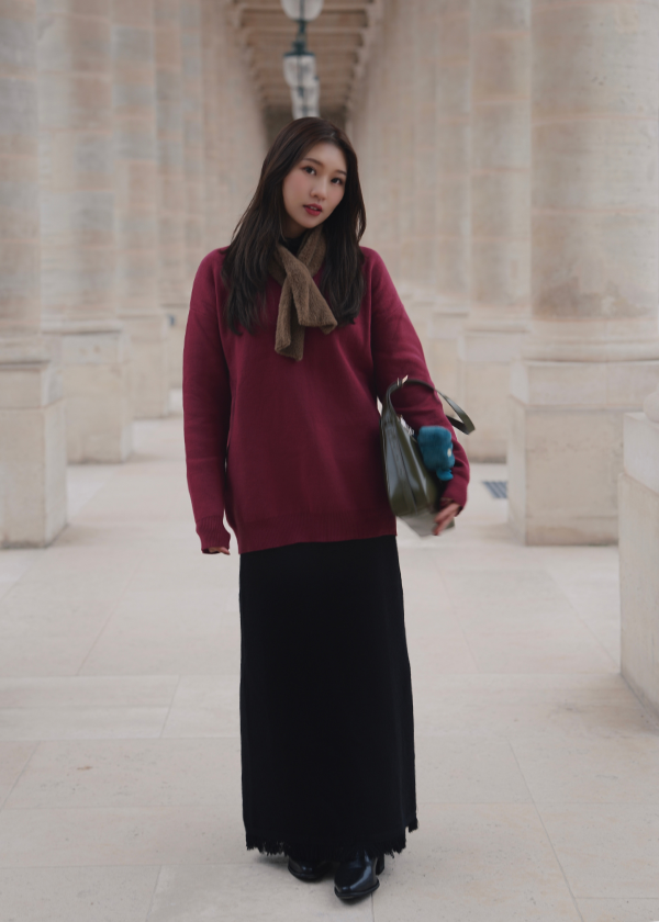 穿搭重點:雪Q針織-簡約輕便短圍巾、A字傘狀-雪Q針織長裙、寬鬆長版-雪Q針織上衣