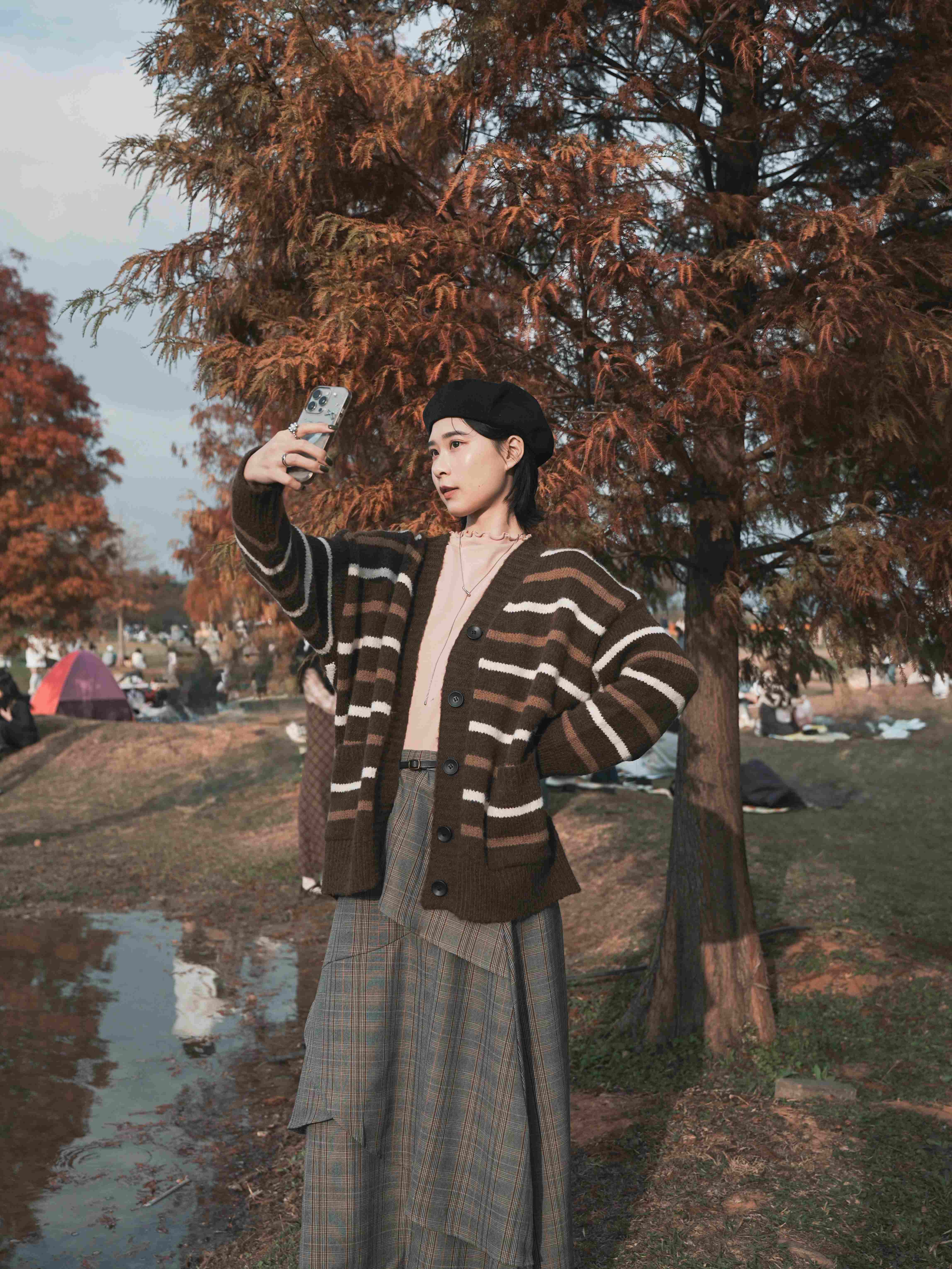 穿搭重點:跳色條紋針織外套、親膚絨面木耳邊搭配上衣、時髦設計感荷葉拼接格裙