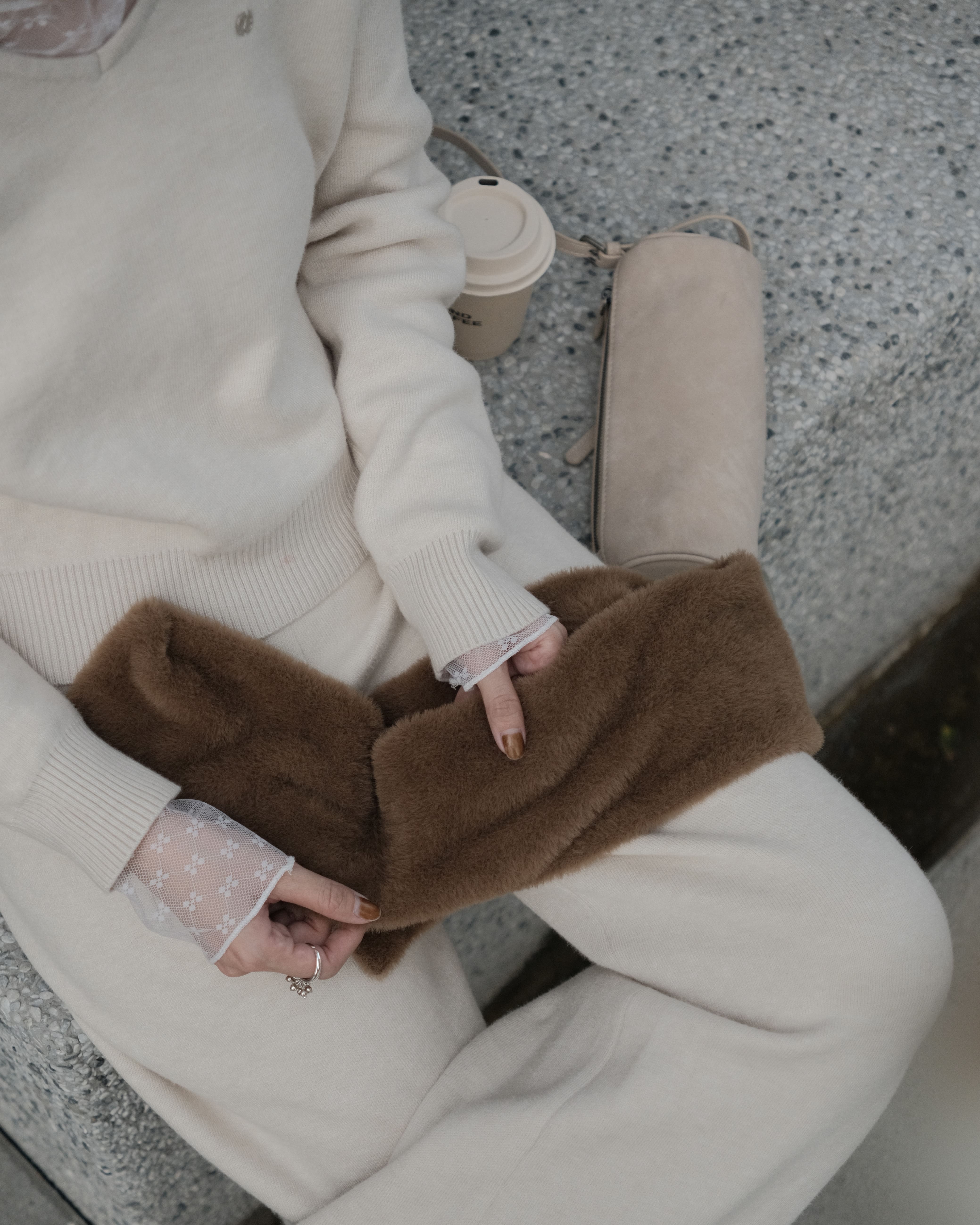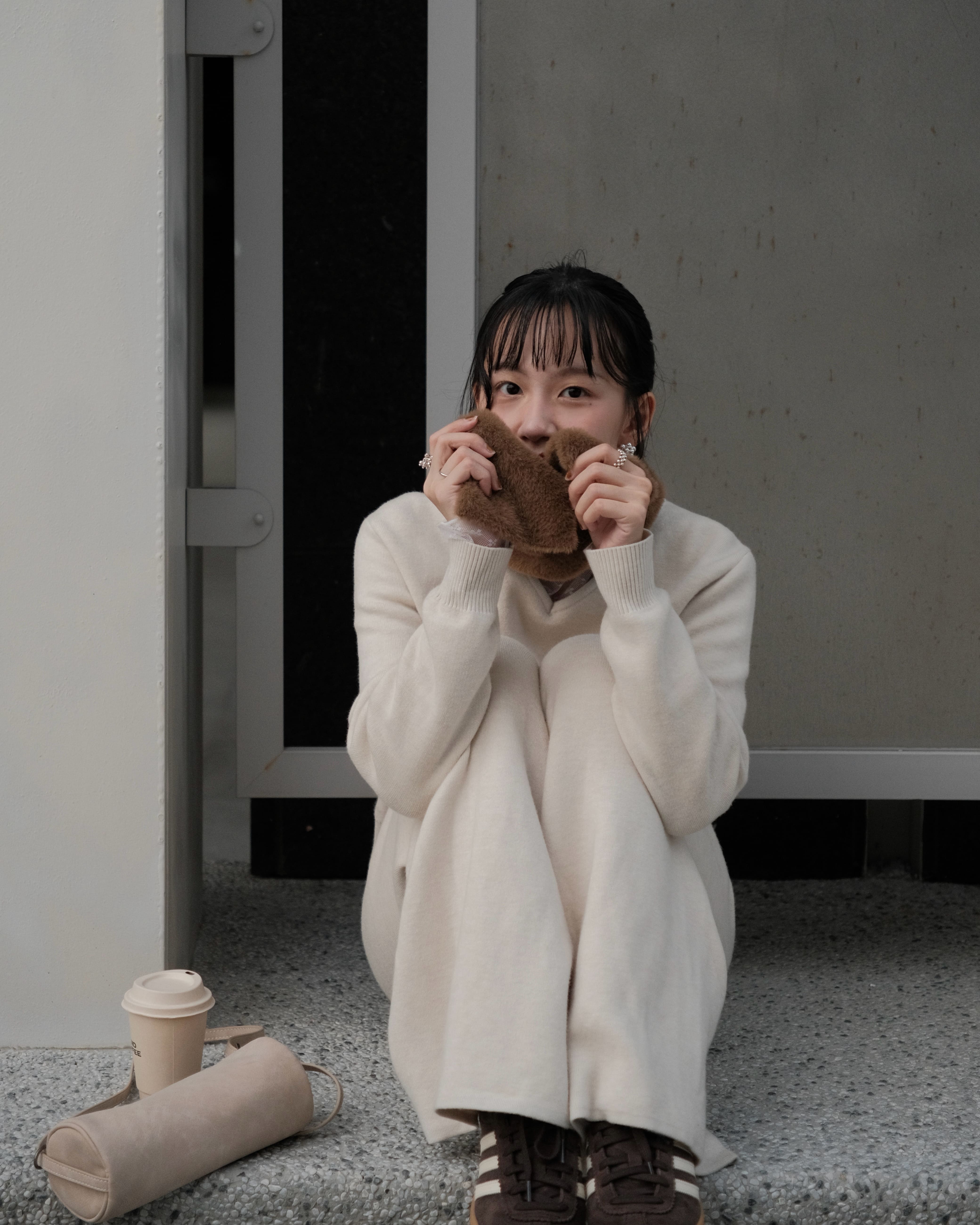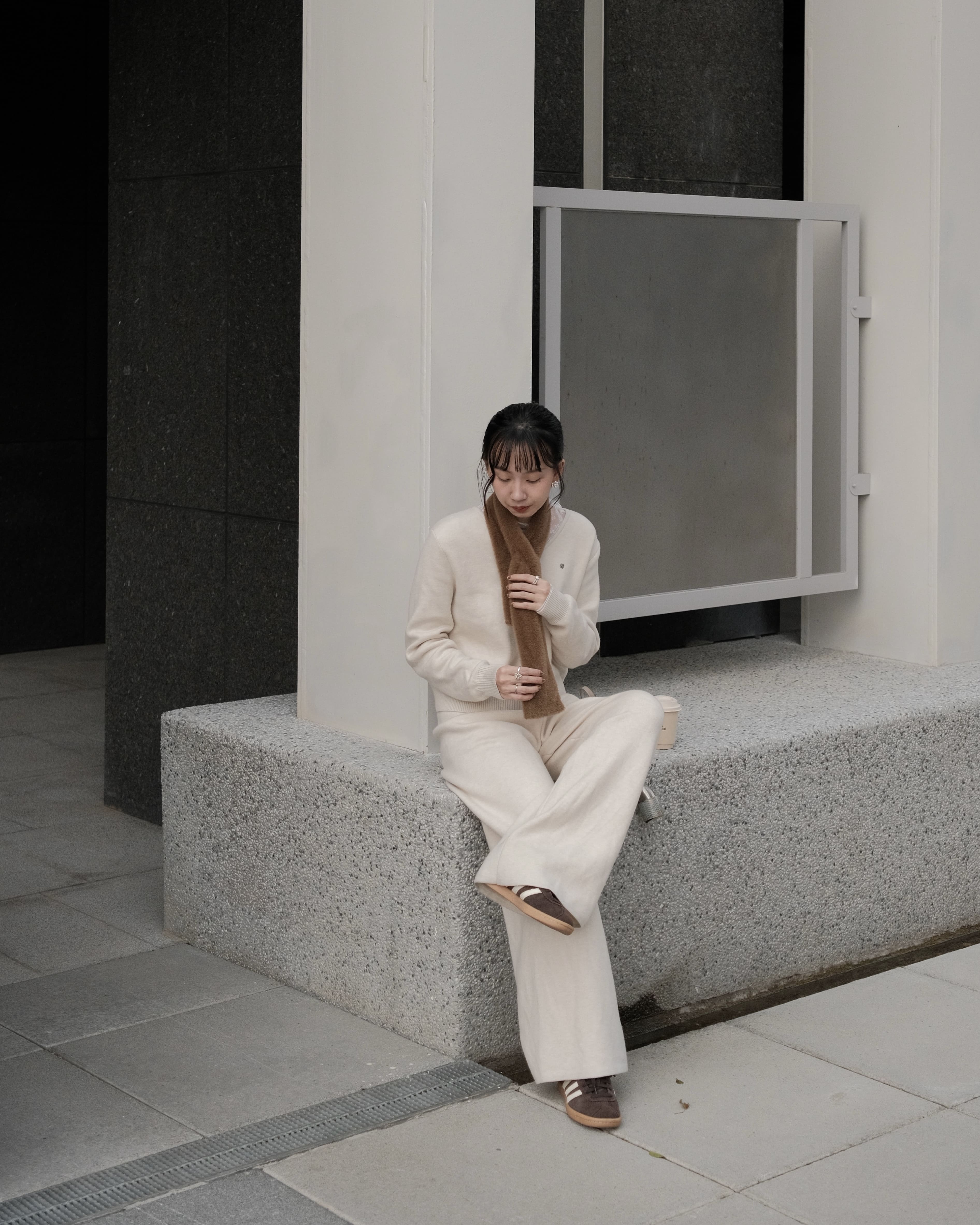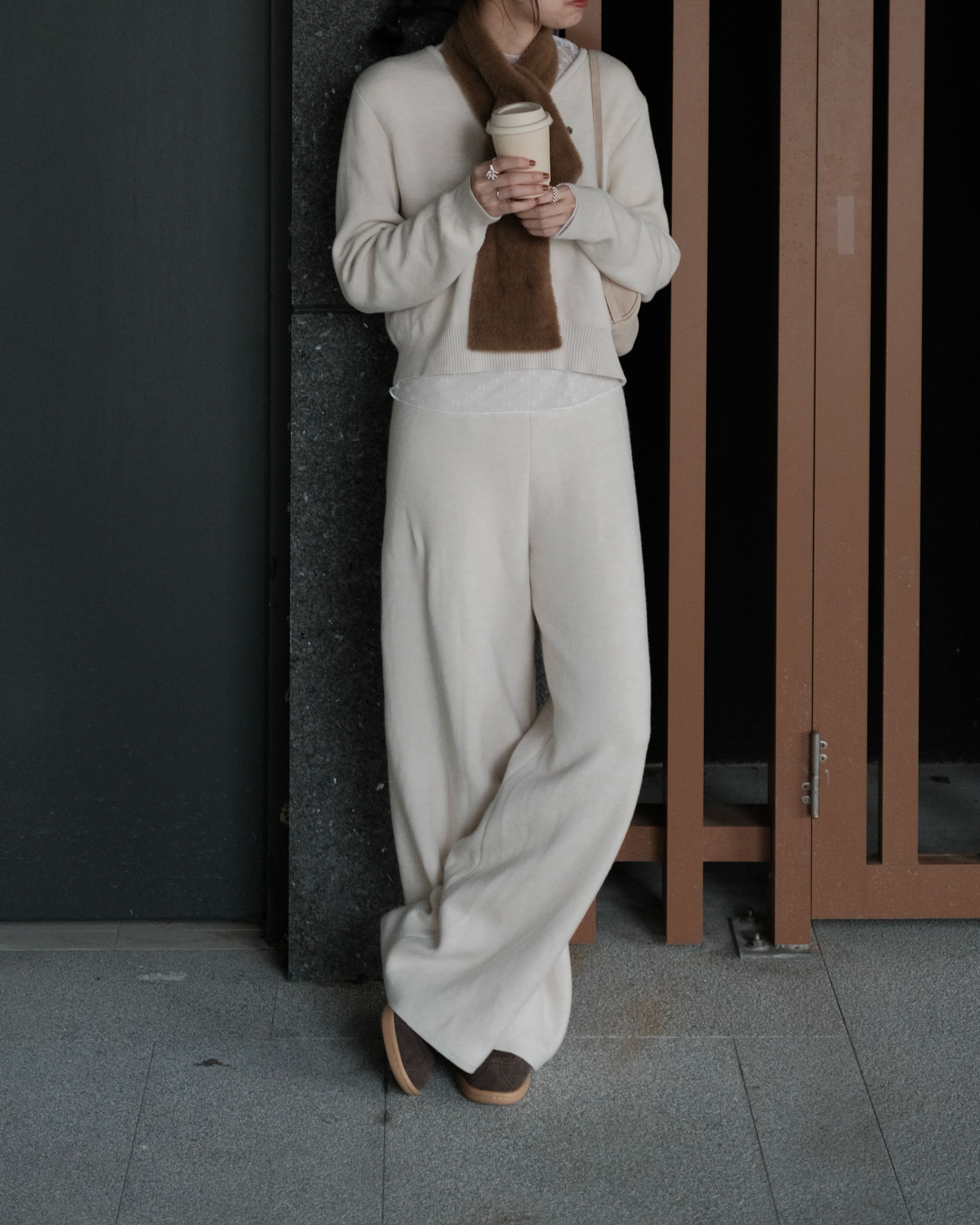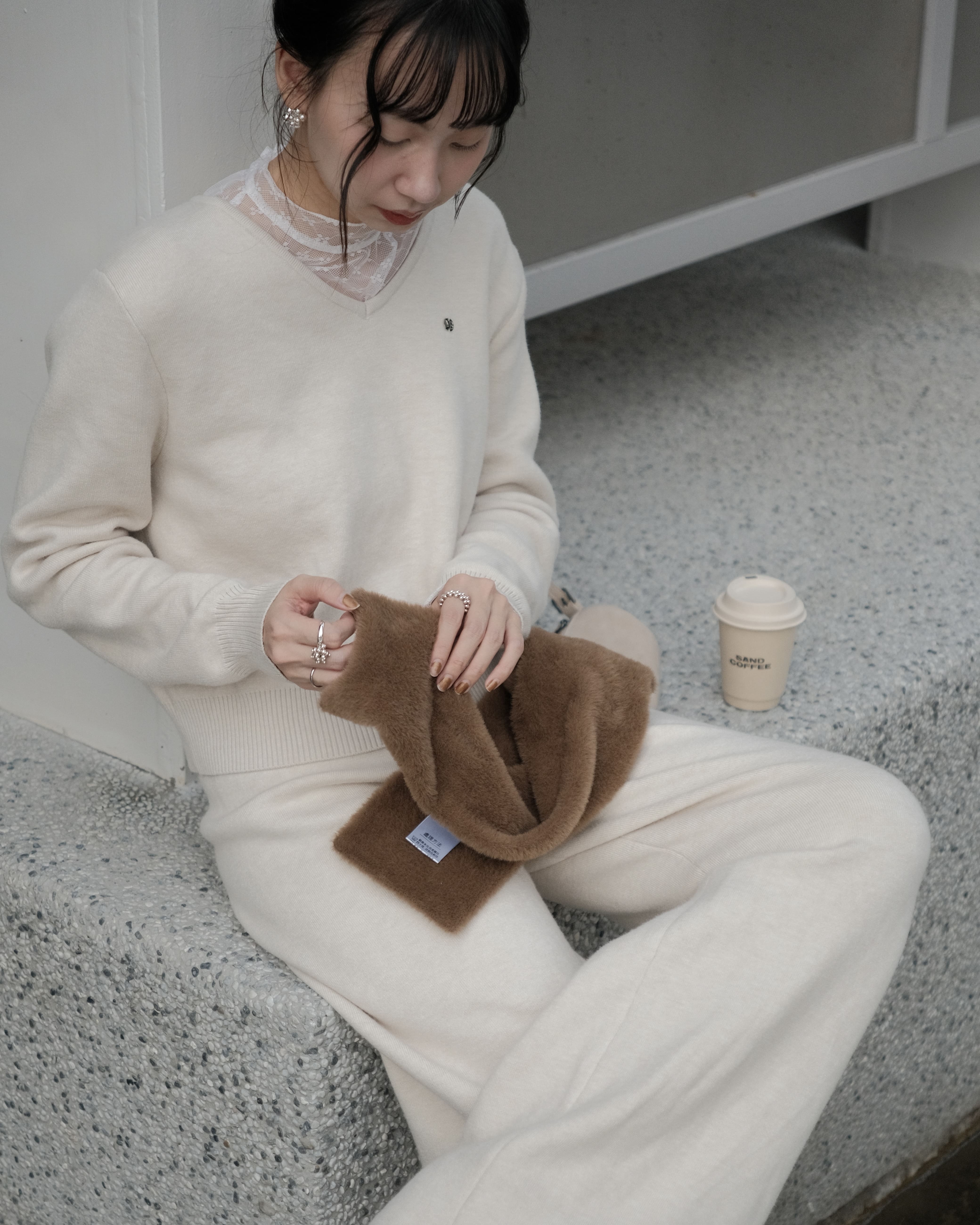 穿搭重點:簡約V領-雪Q針織上衣、慵懶修身-雪Q針織長褲、雪Q針織-簡約輕便短圍巾
