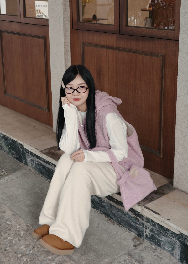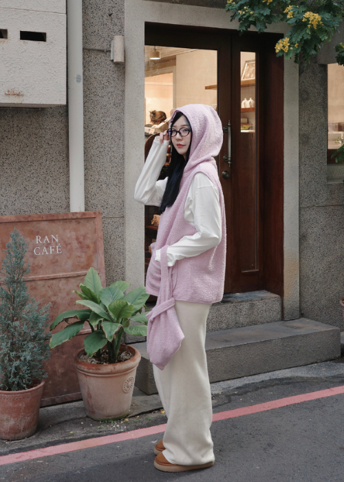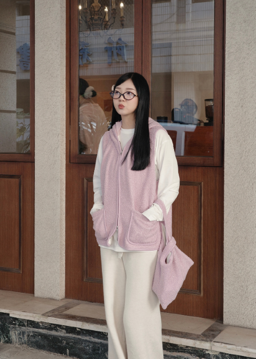 穿搭重點:捲捲毛舒服蕾-連帽拉鍊背心、簡單寬鬆好搭棉上衣、慵懶修身-雪Q針織長褲、捲捲毛舒服蕾-溫暖心意購物袋