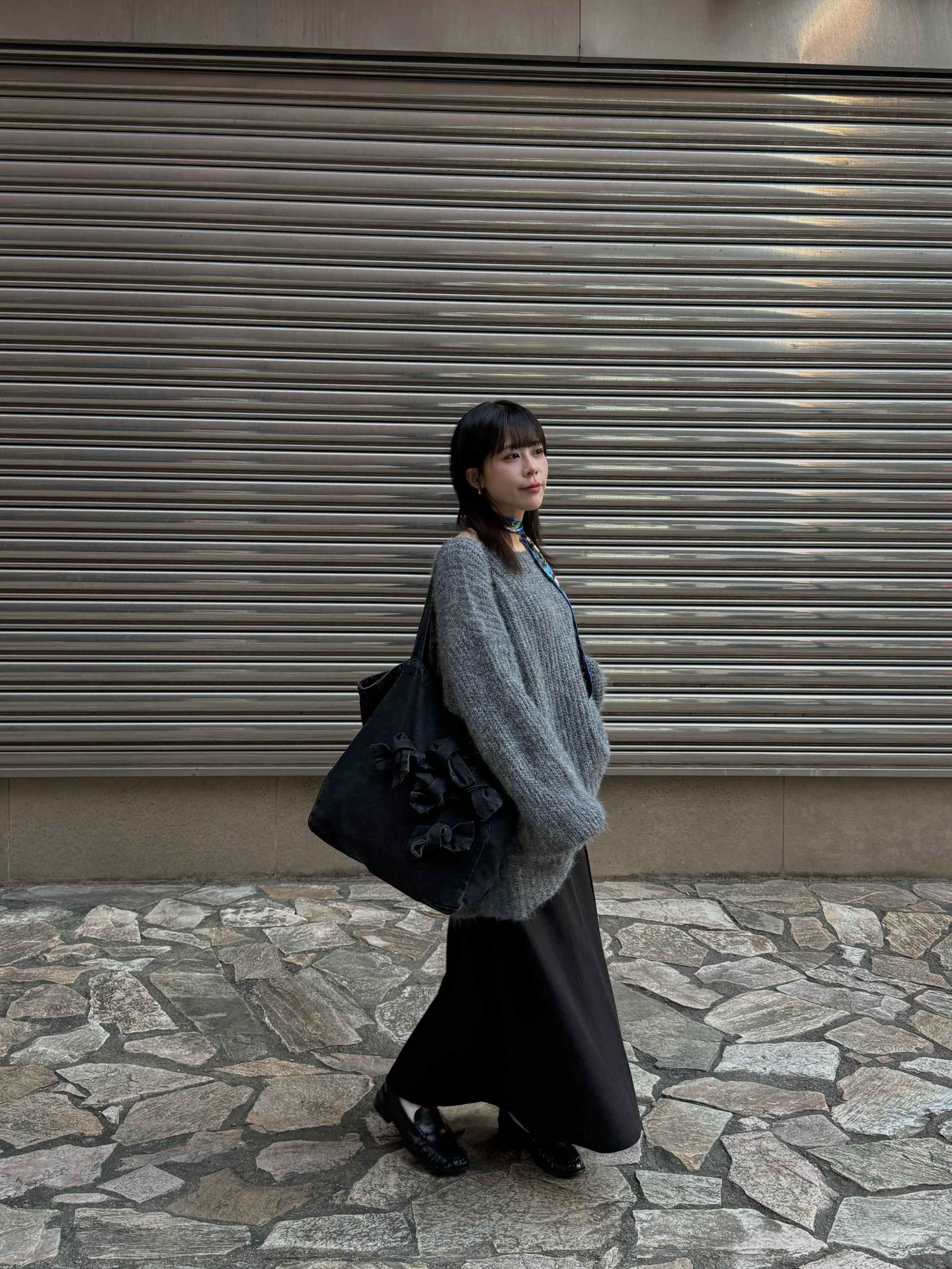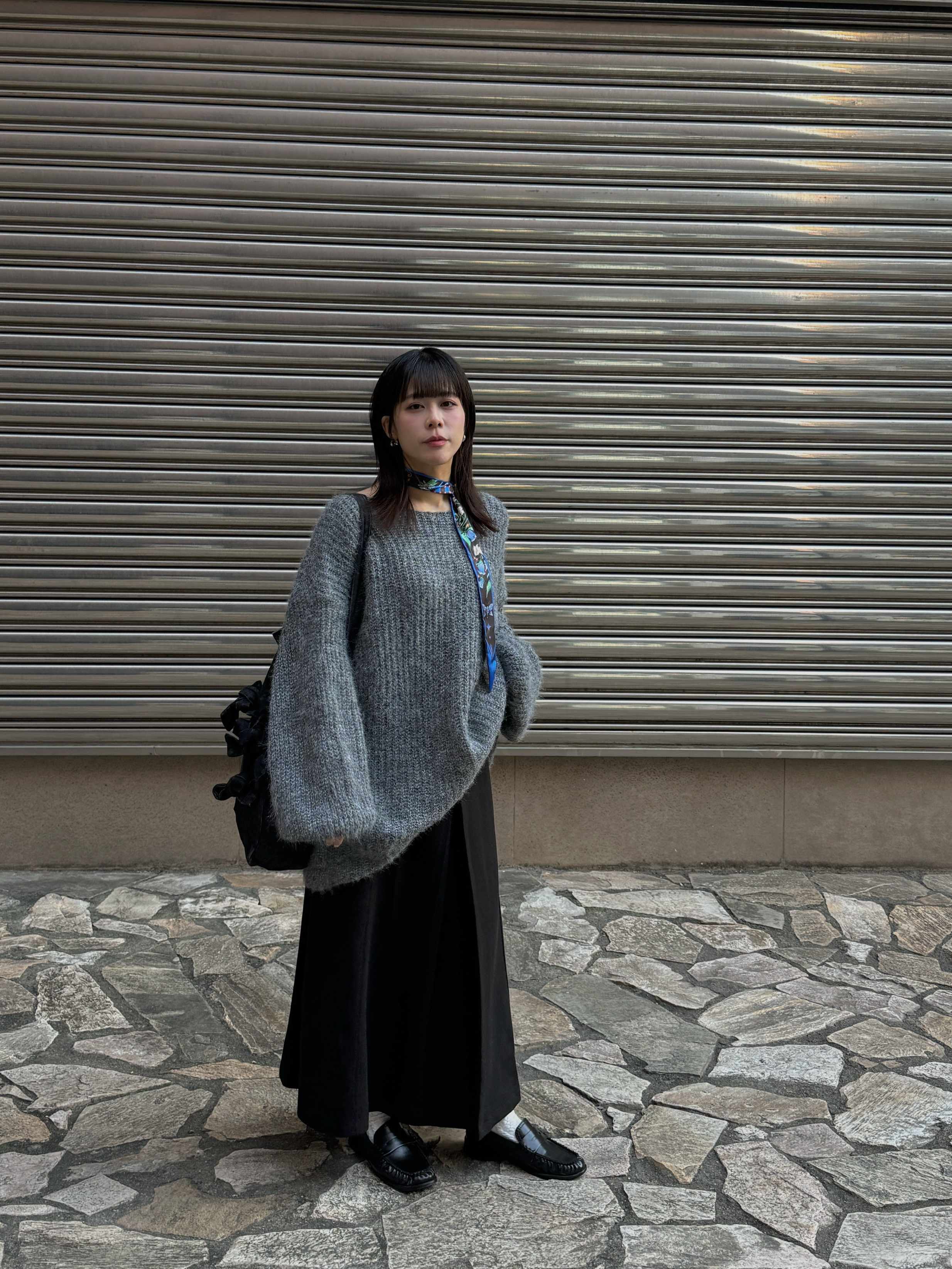穿搭重點:質感綿羊毛圓領針織上衣、挺版紋理A字長裙
