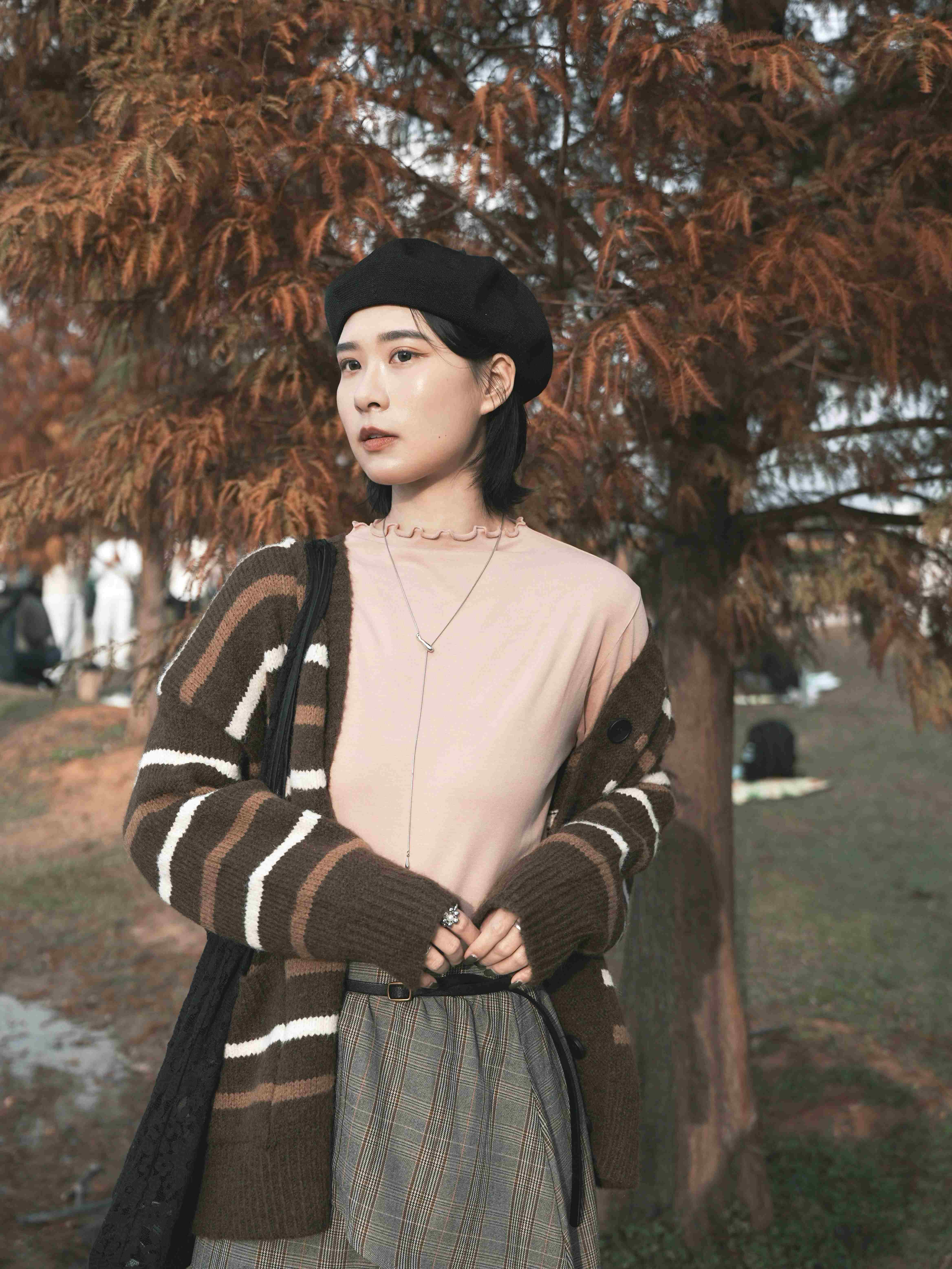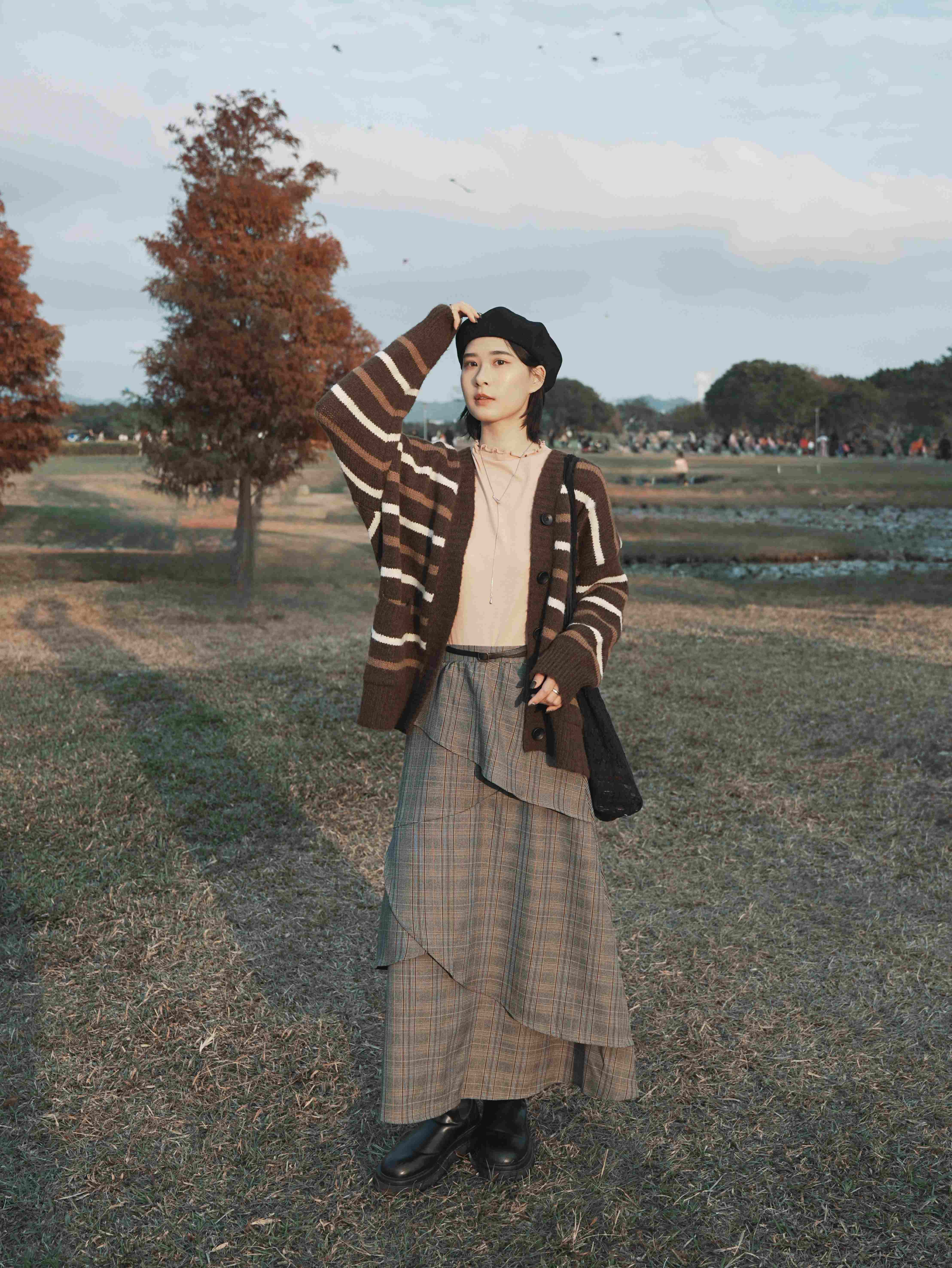 穿搭重點:跳色條紋針織外套、親膚絨面木耳邊搭配上衣、時髦設計感荷葉拼接格裙