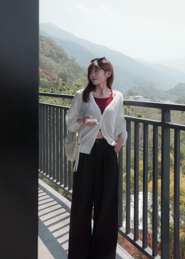 穿搭重點:涼感細肩帶削肩Bra Top、必備百搭針織外套、設計腰頭寬版西裝長褲