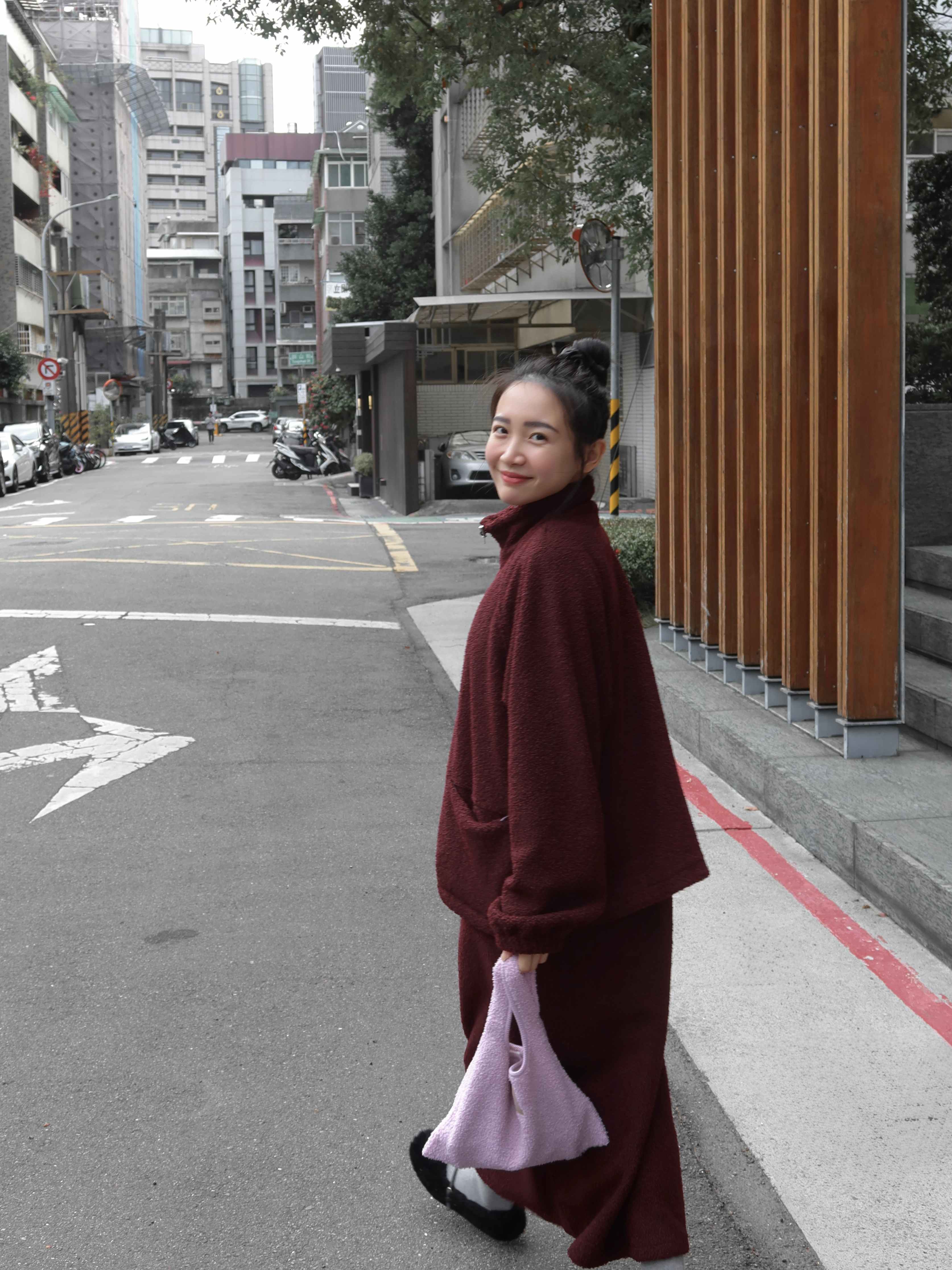 穿搭重點:捲捲毛舒服蕾-小立領拉鍊外套、捲捲毛舒服蕾-慵懶長裙、捲捲毛舒服蕾-溫暖心意購物袋