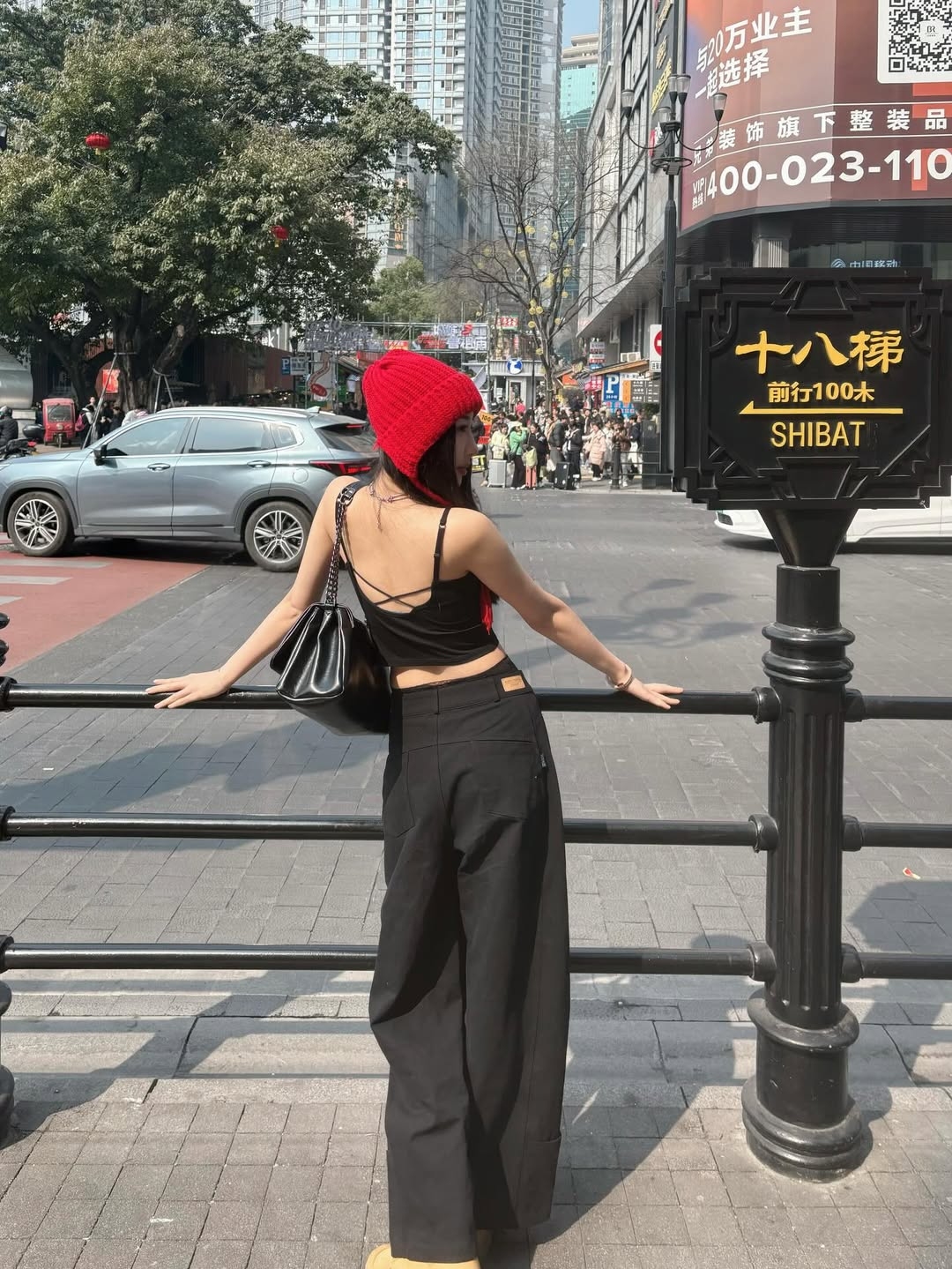 穿搭重點:斜紋水洗棉彎刀褲 、交叉美背仙女bra top