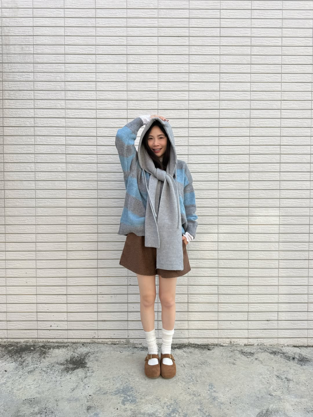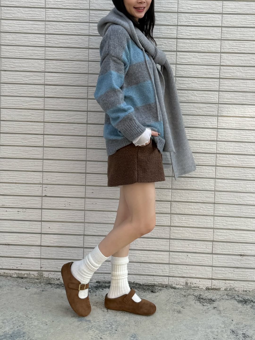 穿搭重點:日常寬條紋針織上衣、泰迪熊捲捲毛短褲、M系列造型連帽圍巾
