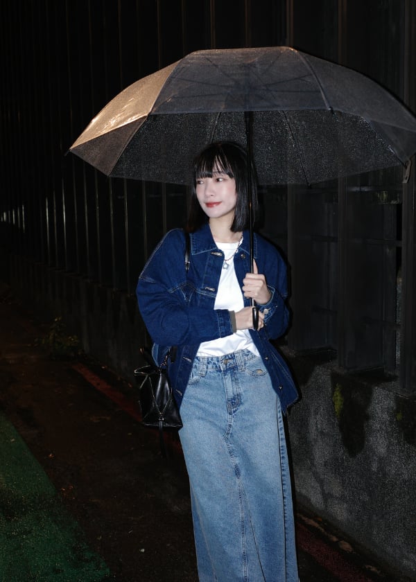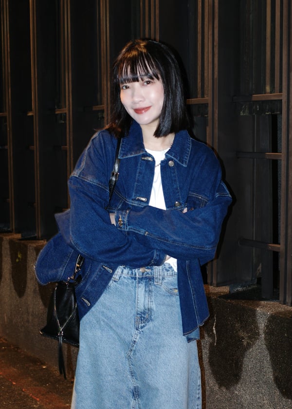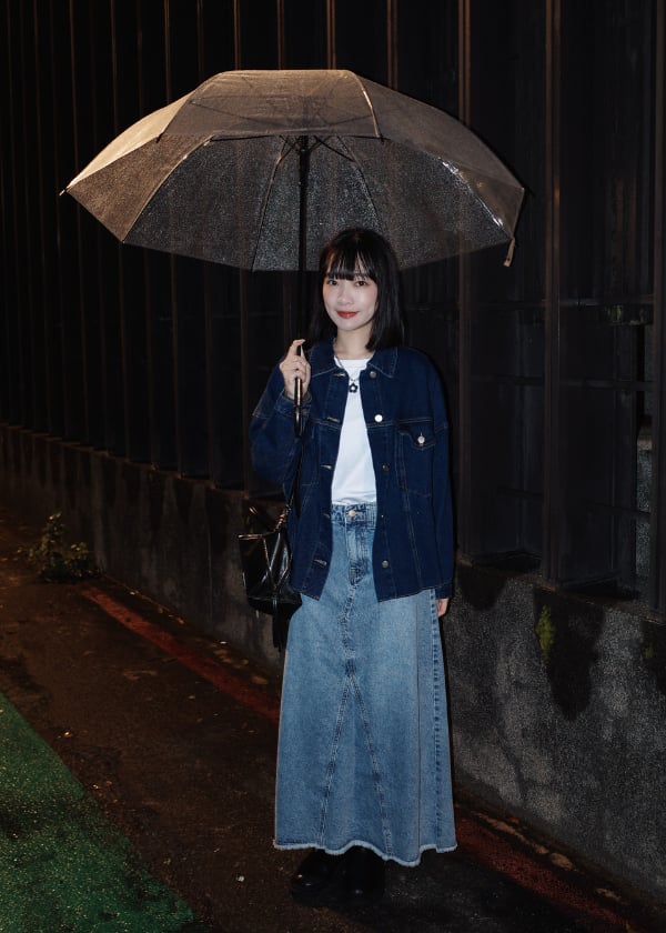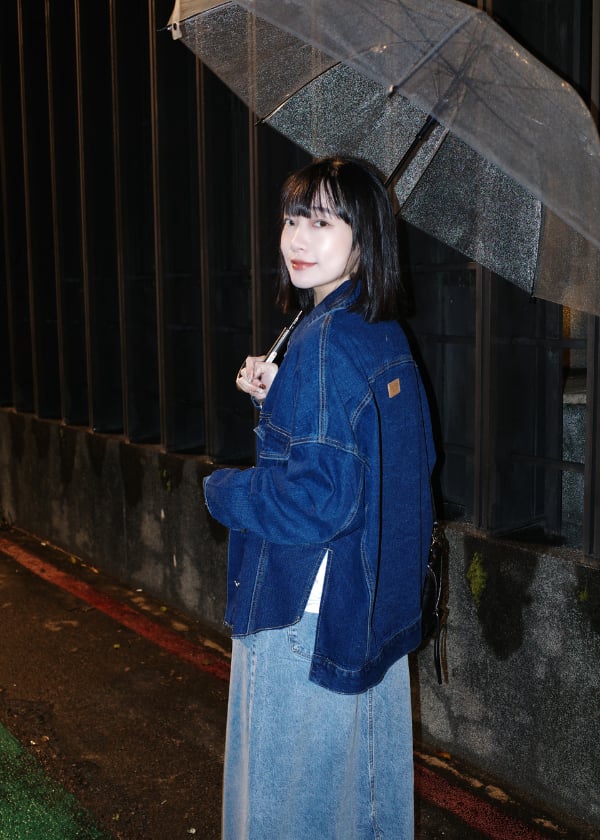 穿搭重點:液態氨柔挺棉-剛剛好基本T恤、仿舊水洗感側開叉丹寧外套、水洗刷色A襬丹寧裙