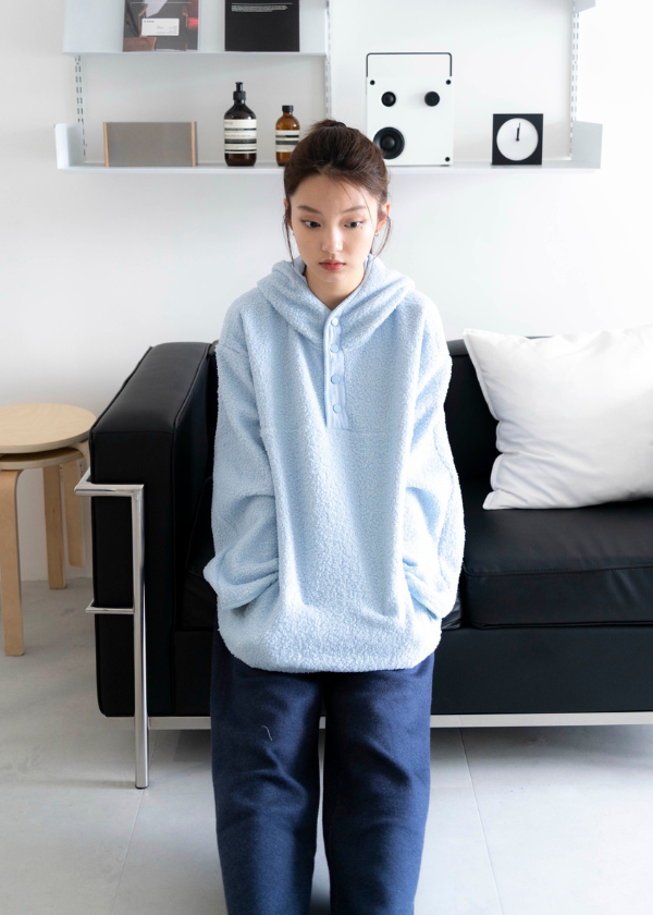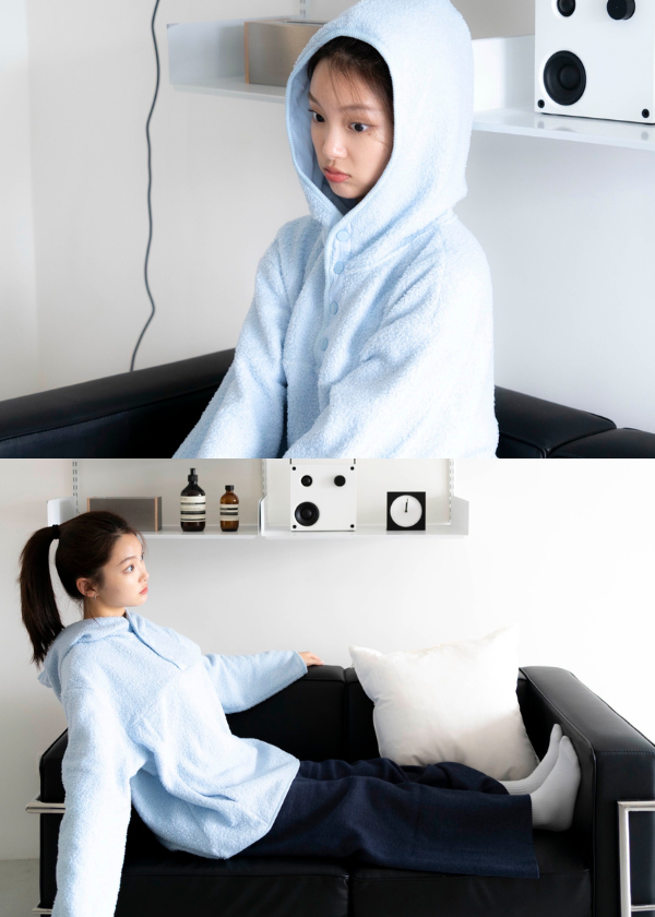 穿搭重點:捲捲毛舒服蕾-連帽口袋大學T、慵懶修身-雪Q針織長褲