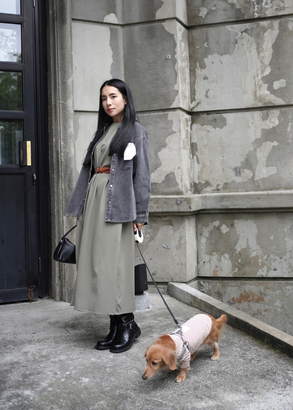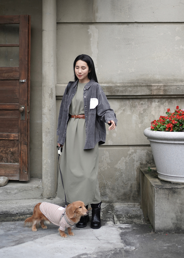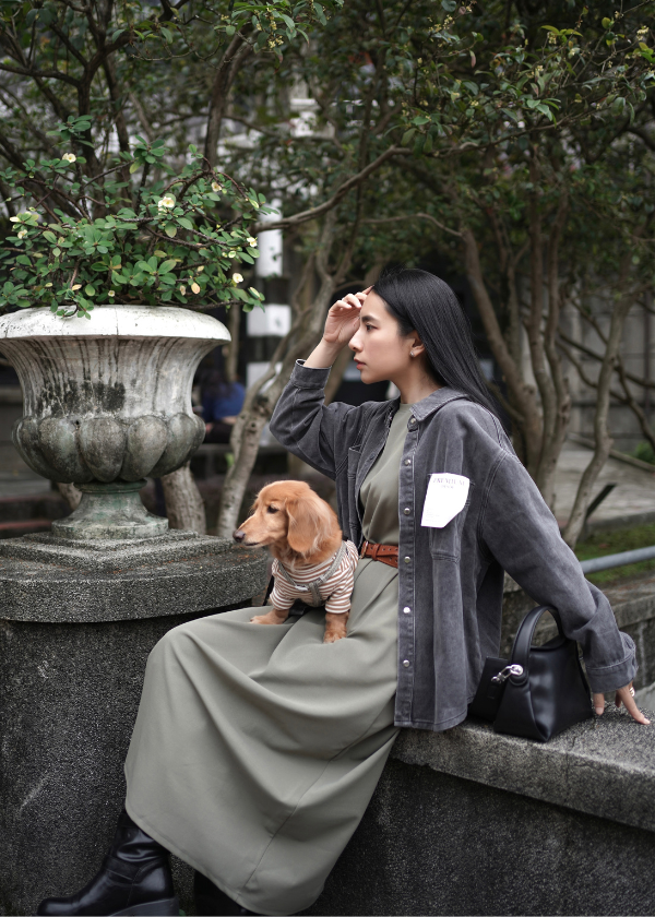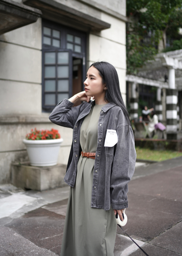 穿搭重點:丹寧個性水洗口袋襯衫、MIT特殊剪裁長洋裝
