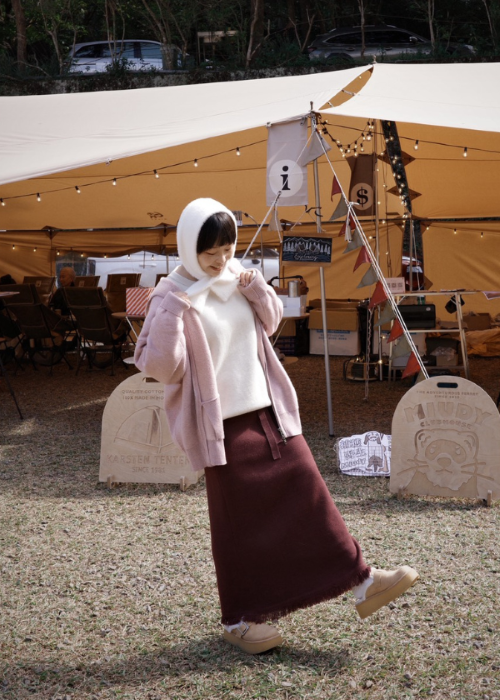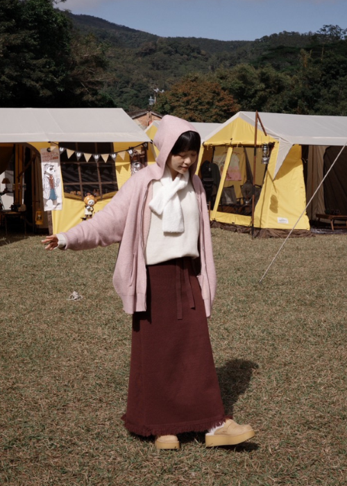 穿搭重點:雪Q針織-簡約輕便短圍巾、A字傘狀-雪Q針織長裙、寬鬆慵懶-雪Q針織外套、基礎圓領-雪Q針織上衣